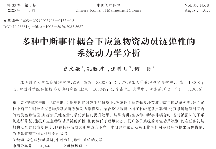 近日,工商管理学院物流管理系史文强副教授团队的研究成果发表于管理科学领域国内高水平期刊《中...