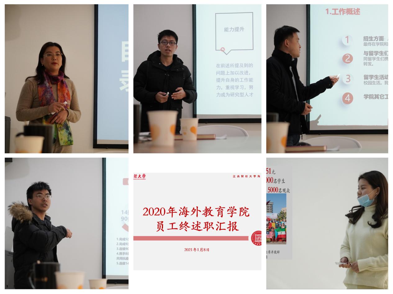 根据学校《江西财经大学教职工年度考核办法》(江财人事字【2020】14号文)的相关要求,海外教育学院于1月8日在学院会议室召开2020年年终工作述职和考核会议,学院院长叶卫华,副院长吕腮菊分别作了工作述职报告,学院全体员工对本职工作进行了年终总结,并对学院领导进行了民主测评。