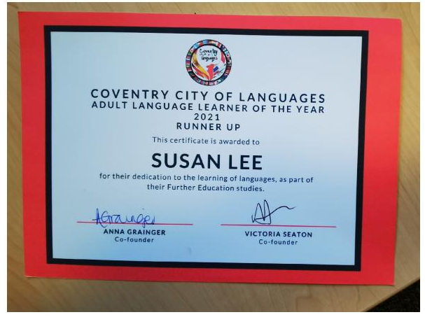 10月8日,英国考文垂市语言协会成立启动仪式在考文垂大学隆重举行,考文垂大学孔子学院学员SusanLee在众多参评者中脱颖而出,荣获2021年考文垂市语言协会“最佳语言学习者”亚军。