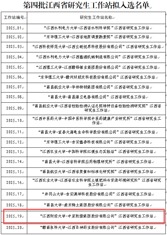 近日,江西省教育厅公布了第四批江西省研究生工作站建设名单,由我校工商管理学院与中至数据集团股份有限公司(简称“中至集团”)联合申报的研究生工作站成功入选,是本批次全校唯一入选的工作站,也是全省本批次20个研究生工作站中唯一的文科类研究生工作站。截至目前,全校累计获批了三个省级研究生工作站。