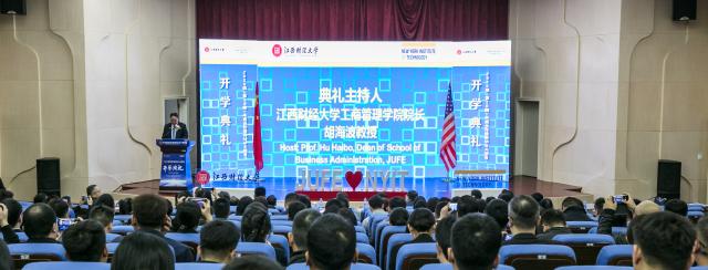 12月8日上午,工商管理学院举行2025级(第26期)中美合作培养MBA项目开学典礼。美国纽约理工学院校长杰瑞•巴伦丁教授、江西财经大学副校长袁红林教授、美国纽约理工学院管理学院院长杰森•盖纳什教授、管理学院执行副院长刘贤方教授、国际商业研究中心主任乔伊斯•裘女士,江西财经大学国际合作与交流处处长龚美君博士、研究生院副院长汪星教授、工商管理学院副院长王鑫博士,中美MBA项目校友代表、大成教育集团创始人王德松博士等出席。2025级(第26期)中美MBA项目管理团队、新生班班主任、教师代表及新生等150余人参加典礼。典礼由工商管理学院院长胡海波主持。