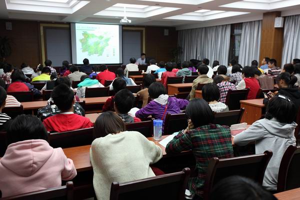 朱来友副厅长首先简单介绍了鄱阳湖生态经济区建设的基本情况,并认为国内外对湖控工程的疑问主要集中在三个方面:一是湖控工程破坏长江中下游生态系统的完整性和连通性,人为割裂江豚及鱼类的洄游通道,直接导致物种消亡;二是湖控工程影响下游供水安全和鄱阳湖水质;三是在枯季维持大面积深水区会改变湿地生态系统的结构和多样性。为回应这些质疑,朱副厅长详细介绍了湖控工程的整个决策过程,认为该工程在广泛地征求国内外专家与相关公益组织意见的基础上进行了多次论证,方案也修改多次,湖控工程已基本上成为一个公益性的工程,其主要功能体现在:一是注重把握“永保一湖清水”的总体要求,科学协调鄱阳湖水质、水位、湿地候鸟三个重要关系;二是注重把握生态工程的基本理念,包括“调枯不调洪”、“建闸不建坝”,“动态管理、阶梯式水位、适应性调度”等理念;三是注重把握“江湖两利”、“流域一体”的护江治江理念,与长江中下游省市共饮共护长江水。因此,鄱阳湖湖控工程的定位为恢复和科学调整江湖关系,提高鄱阳湖区的经济和生态承载能力,这必将对江西的生态文明发展道路起到重要的作用。朱副厅长的精采演讲赢得师生们的热烈掌声,同时,近十位师生向朱厅长发问,朱副厅长进一步就相关问题一一回应。整个讲座持续两个多小时,取得圆满成功。