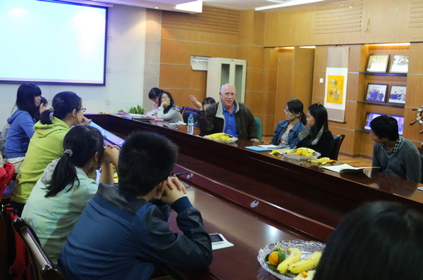 10月16日晚七点,理查德教授受江西财经大学国际学院科研小组邀请,在南区综合楼八楼参加首届国际学院科研沙龙活动,与小组成员就科研方法问题进行深度探讨。科研小组的同学希望通过此次沙龙能够与理查德教授进行一些学术研究方面问题的探讨,并希望通过这次的交谈能够走近诺贝尔奖,以此激励更多的同学致力于学术研究。沙龙以展示马丁卡普拉斯教授的获奖现场视频开始,幽默的理查德教授与小组成员们分享了几件叔叔的轶事,科研沙龙在轻松活泼的氛围里拉开了序幕。场上气氛活跃,科研小组的成员们踊跃互动,提出的问题新颖而大胆,理查德教授针对同学们的提问做出了耐心而详细的回答。
