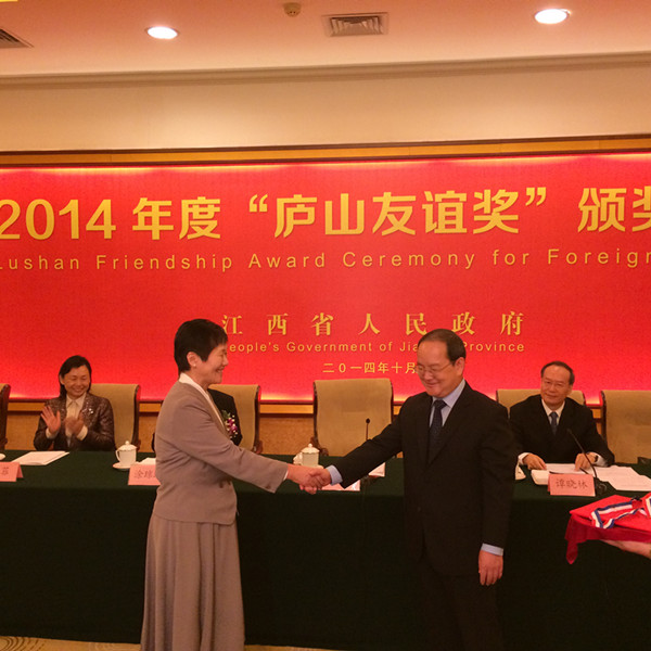 据悉,我校外国语学院日籍教师田中弘美荣获2014年度“庐山友谊奖”,这是江西省政府给予在赣工作外国专家的最高荣誉。10月29日,2014年“庐山友谊奖”颁奖典礼在江西饭店召开,省长鹿心社为获奖外国专家颁奖。