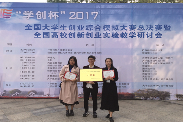 10月22日,“学创杯”2017全国大学生创业综合模拟大赛总决赛在湖北经济学院举行,来自全国100余所高校的105支队伍、300多名选手参加了比赛,我校工商管理学院2014级陆洪赟、冷昕玥同学,财税与公共管理学院2015级李显雅同学组成的“325”参赛团队在计算机实践教学中心教师赖维玮、吴小芳和胡向亮的指导下,以优异成绩荣获全国总决赛一等奖。