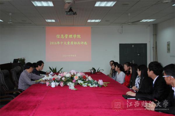 4月17日,信息管理学院十大素质标兵评选活动顺利举行,党委书记邹春发,党委副书记肖建文,副院长万建香,分团委书记陶志超等作为评委参加了此次评选活动。