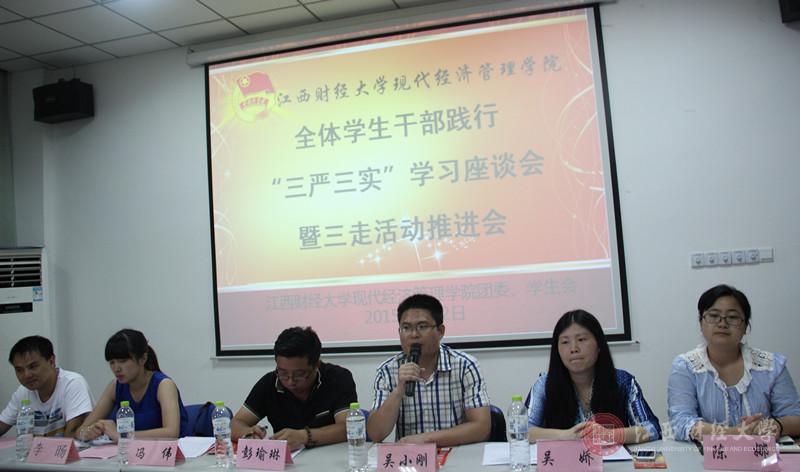 6月2日下午五点十分,现代经济管理学院“三严三实”学习座谈会暨三走活动推进会于枫林园大学生活动中心403开展。学院吴小刚副院长、会计学系团总支书记彭瑜琳老师、经济学系团总支书记张艳青老师、文法系团总支负责人冯伟老师、信息管理系团总支负责人陈娜老师、团委干事李旸老师、工商管理系秘书胡传明老师、外语系秘书王锐愚老师和院系部长及以上的学生干部参加了座谈会,并由团委吴娇副书记主持。