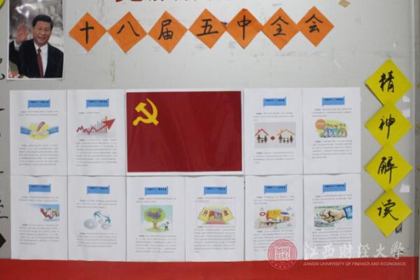 在新媒体成为时代热潮的当下,工商记者团不忘初心,始终坚持党团时事资讯宣传栏的制作。随着十八届五中全会的闭幕,麦庐校区北区的宣传栏上便出现了众多有关十八届五中全会的亮点解读。有的是关于五大发展理念即“创新,协调,绿色,开放,共享”的详细介绍,趣味链接;有的是关于十大惠民政策即“收入,扶贫,教育,社保,计生,物价,环保,服务,网络,安全”等方面的现实生活影响;有的则是与大学生息息相关的时政亮点评析,如国家促进就业创业,坚持就业优先战略。