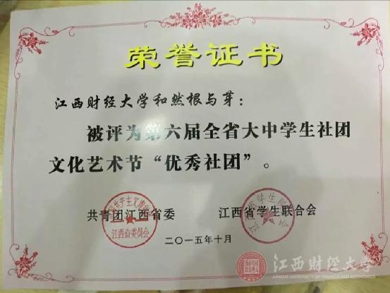 近日,由共青团江西省委、江西省学生联合会举办的“共筑中国梦,青春勇担当”第六届全省大中专学生社团文化艺术节落下帷幕,我校和然根与芽协会荣获第六届全省大中专学生社团文化艺术节“优秀社团”称号。