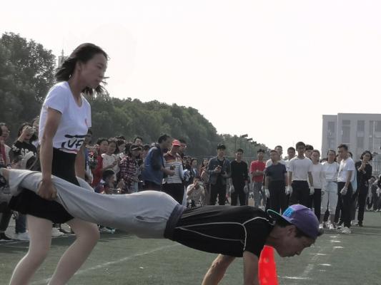 本次比赛有12队参加,每队男女生各10人。赛场上,会计学院的运动员们配合默契,男生头戴一顶帽子俯撑爬行,女生挽住男生两腿用脚前行,距离15米处有一障碍物,两人必须绕过障碍物返回,爬行至终点;当男生双手触线后同队队员可以把帽子戴到下组男生头上,各组依次接力,比赛有条不紊地进行着,最终取得了第三名的好成绩。