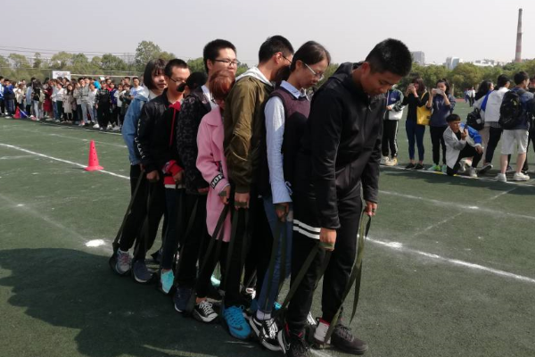 其后,就是让人眼前一亮的集体运动项目。当镜头切换到推小车这项比赛时,运动员们协作配合,男运动员双手撑地,女运动员托起男生的双腿,奋力前行。而此时此刻,在另一个场地,有轨电车集体项目比赛正在进行,一个个小队,默契配合,团结合作也正是我江财所宣扬的精神。