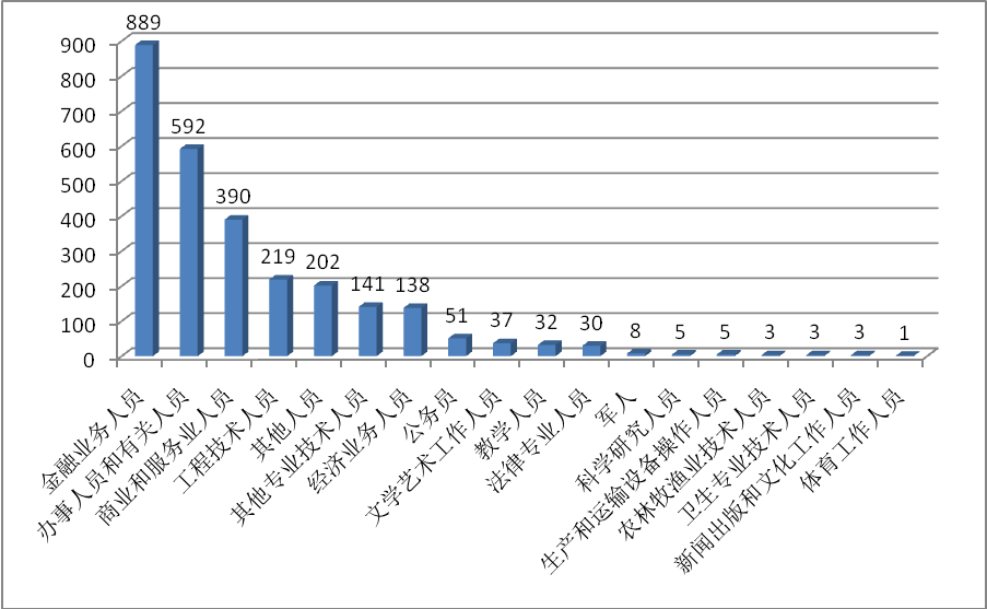 数据统计显示,在我校2014届就业的3649名毕业生中,近1/4的毕业生(889名)从事金融业务人员工作岗位。其它工作岗位具体人数分布。(见图4)