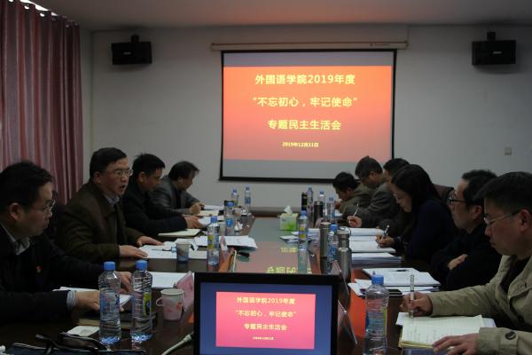 根据中央、省委及学校“不忘初心、牢记使命”主题教育领导小组的部署要求,12月11日下午2:30,外国语学院党委在英庐二楼会议室召开“不忘初心、牢记使命”专题民主生活会。校党委副校长袁雄同志出席并作点评讲话。省委第十三巡回指导组副组长周世敏、指导组成员刘清涛、校组织部部长许基南同志到会指导。院领导班子全体成员参加会议,会议由院党委书记涂远武主持。
