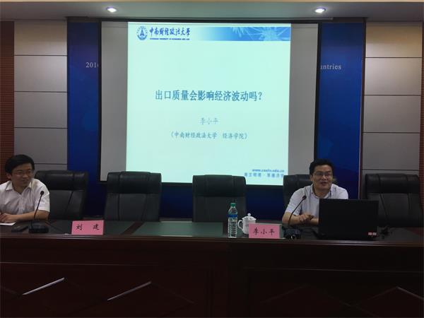 5月28日下午,中南财经政法大学李小平教授应邀来校,作题为“出口质量会影响经济波动吗?”的学术讲座。国际经贸学院首席教授许统生教授、学院部分教师和学生代表参加了此次讲座,讲座由刘建博士主持。