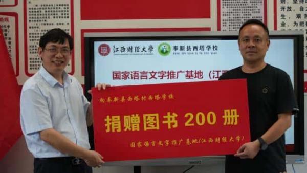 蒋国河代表国家语言文字推广基地(江西财经大学)向西塔学校授予活动实践基地牌匾,并向西塔学校捐赠图书200册。蓝圣烈代表西塔学校对江西财经大学的支持表示衷心的感谢。随后,双方就西塔学校的师生情况、教学设施等议题进行了深入交流。
