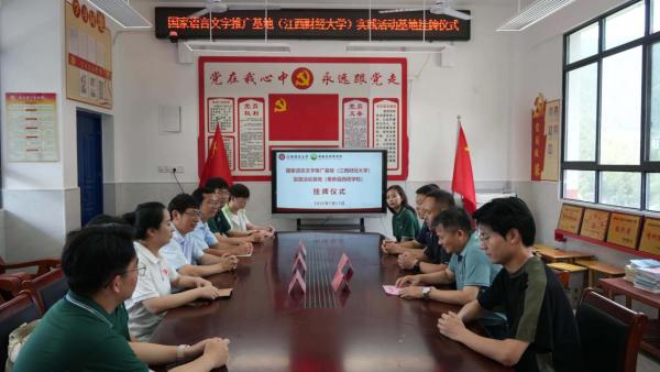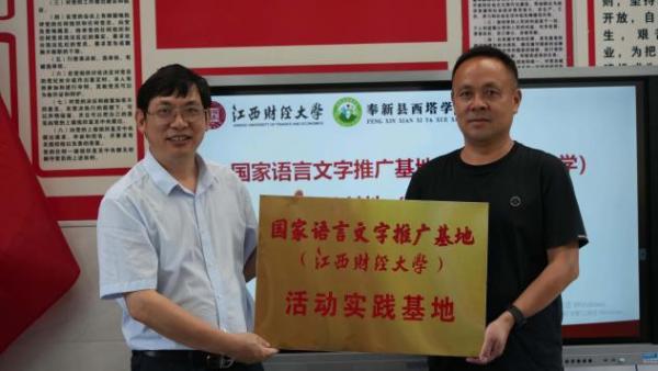 7月17日上午,为助力国家通用语言文字高质量普及,充分发挥国家语言文字推广基地辐射作用,国家语言文字推广基地(江西财经大学)实践活动基地挂牌仪式在奉新县西塔学校举行。国家语言文字推广基地(江西财经大学)副主任、社会与人文学院院长蒋国河、江西财经大学驻西塔村第一驻村书记杨有亮、西塔学校校长蓝圣烈及师生代表出席挂牌仪式。