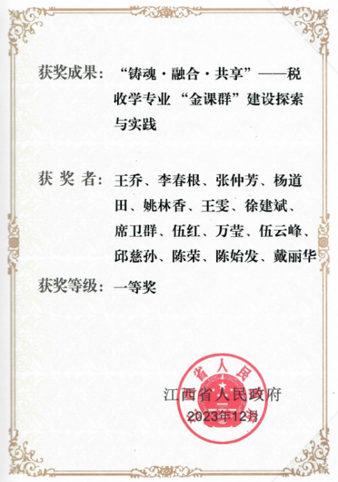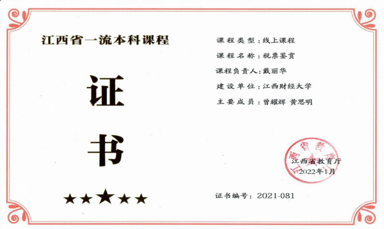 三是特色育人标杆。如江西省名师工作室(匡小平教授领衔)、省级一流课程《税票鉴赏》(戴丽华团队)。