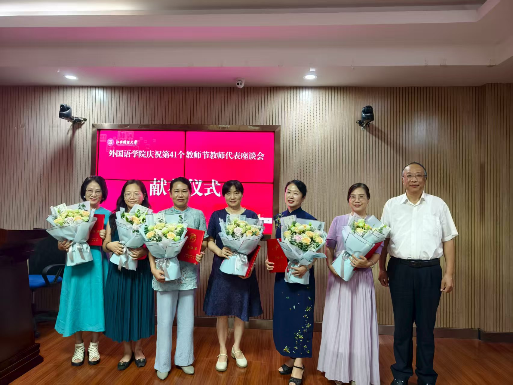 9月10日下午,为庆祝第41个教师节,弘扬尊师重教优良传统,外国语学院举行教师节座谈会,副校长阙善栋和学院2025年获长期从教荣誉教师、即将荣休的教师代表、校级骨干教师、教学科研突出人员、教师代表及学生代表欢聚一堂,共同庆祝这个属于教育工作者的光荣节日。