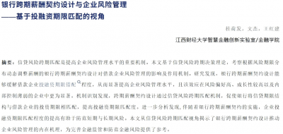 近日,江西财经大学智慧金融创新实验室主任、金融学院桂荷发教授(第一作者),江西财经大学智慧金融创新实验室、金融学院2023级金融学博士研究生文杰(第二作者),江西财经大学智慧金融创新实验室、金融学院副院长(牵头行政工作)王红建教授(通讯作者)合作研究的论文《银行跨期薪酬契约设计与企业风险管理——基于投融资期限匹配的视角》在国内权威A期刊《金融研究》2025年第9期发表。