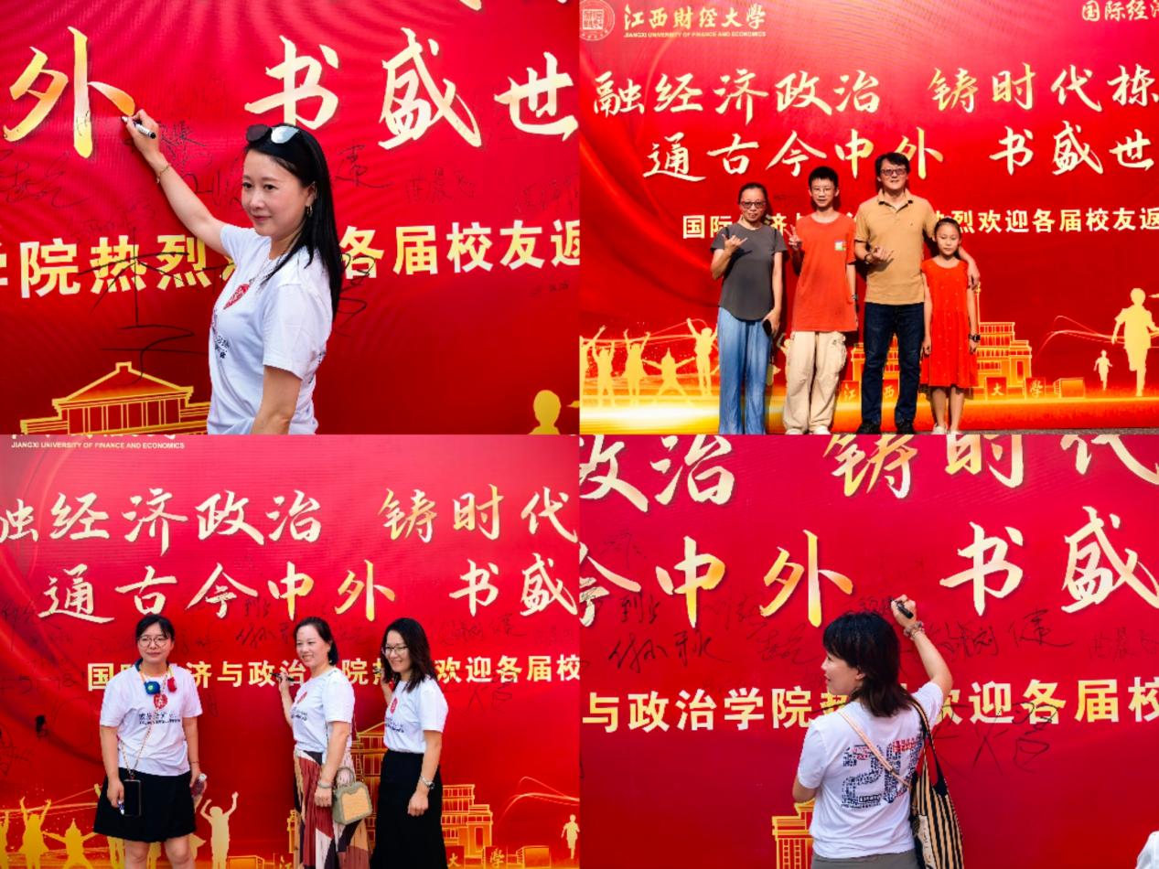 国际经济与政治学院打造“家文化”的氛围欢迎各届校友返校。学院提前谋划,专人对接各返校班级。志愿者早早到达岗位,热情引导校友们于签名墙前签到,在镜头前留影,定格重逢的喜悦。签名墙前笑语不断,怀旧午餐重温当年滋味。午后,学院还协助2001级国贸6班校友开展班级活动,大家观看着饱含青春记忆的视频,畅谈别后岁月,视频中的每一帧都流转着熟悉的面孔,每一处都承载着青春的印记。相聚虽短,情谊绵长;师生共话,温暖如初。