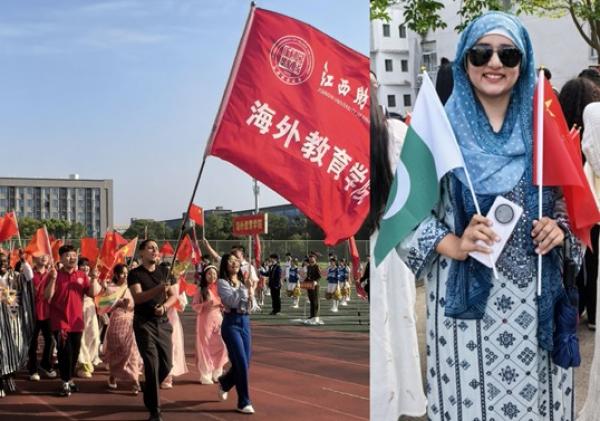 就在这片洋溢着期待与热力的氛围中,一次美好的偶然如同璀璨的流星,悄然划过天际。来自海外教育学院的国际学生们整齐地在路旁集队,他们初来乍到,彼此之间带着一丝腼腆与拘谨。然而,一个真诚的微笑,一声热情的“Hello”,就像温暖的阳光穿透了云层,轻轻化解了他们之间的陌生感。尽管他们交流不多,但从手中不停挥舞的各国国旗,以及脸上那灿烂如阳光的笑容中,足以看出他们对这场运动会的向往与期待。爽朗的笑声不时在人群中响起,如同欢快的音符,瞬间消融了文化与语言的隔阂。随后,他们一起挥舞着旗帜,齐声喊着“I love Jiangxi, I loveChina!”的口号,迈着坚定而又欢快的步伐,走向体育场。那整齐的步伐,那响亮的口号,仿佛在向世界宣告:体育,是连接不同国家和民族的桥梁。