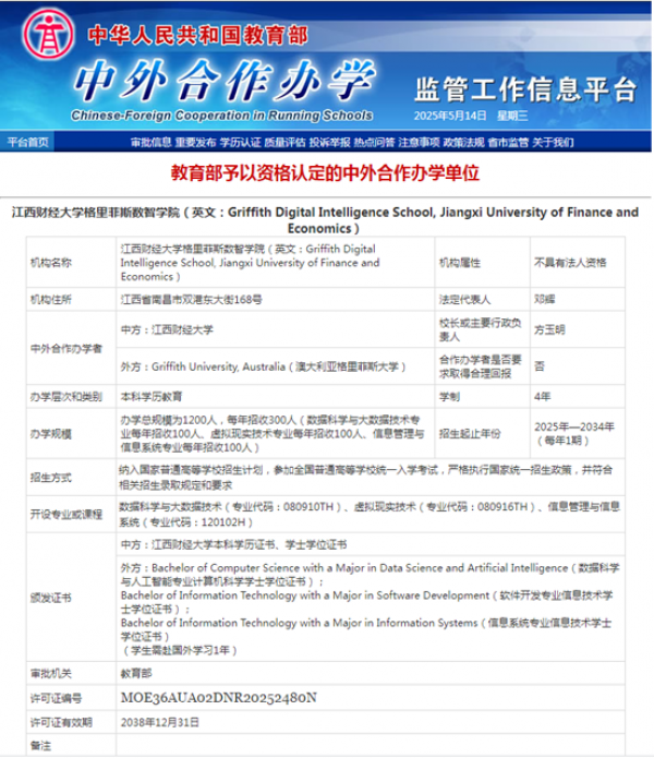 学校积极引入世界一流教育资源和创新要素,与澳大利亚格里菲大学联合申报中外合作办学机构,并在5月份成功获批,成为江西省首家中外合作办学机构,实现了历史性突破。学校按照高起点、高水平建设的要求,正系统规划格里菲斯数智学院的发展。同时对照中外合作办学“提质增效”要求,扎实做好已获批项目的实施工作,学校现有的3个中外合作办学项目(与美国纽约理工大学合办MBA项目、与瑞典达纳拉合办软件工程本科项目、与俄罗斯圣彼得堡国立经济大学合办数字经济本科项目)招生形势稳步向好,项目声誉和影响力逐年提升。