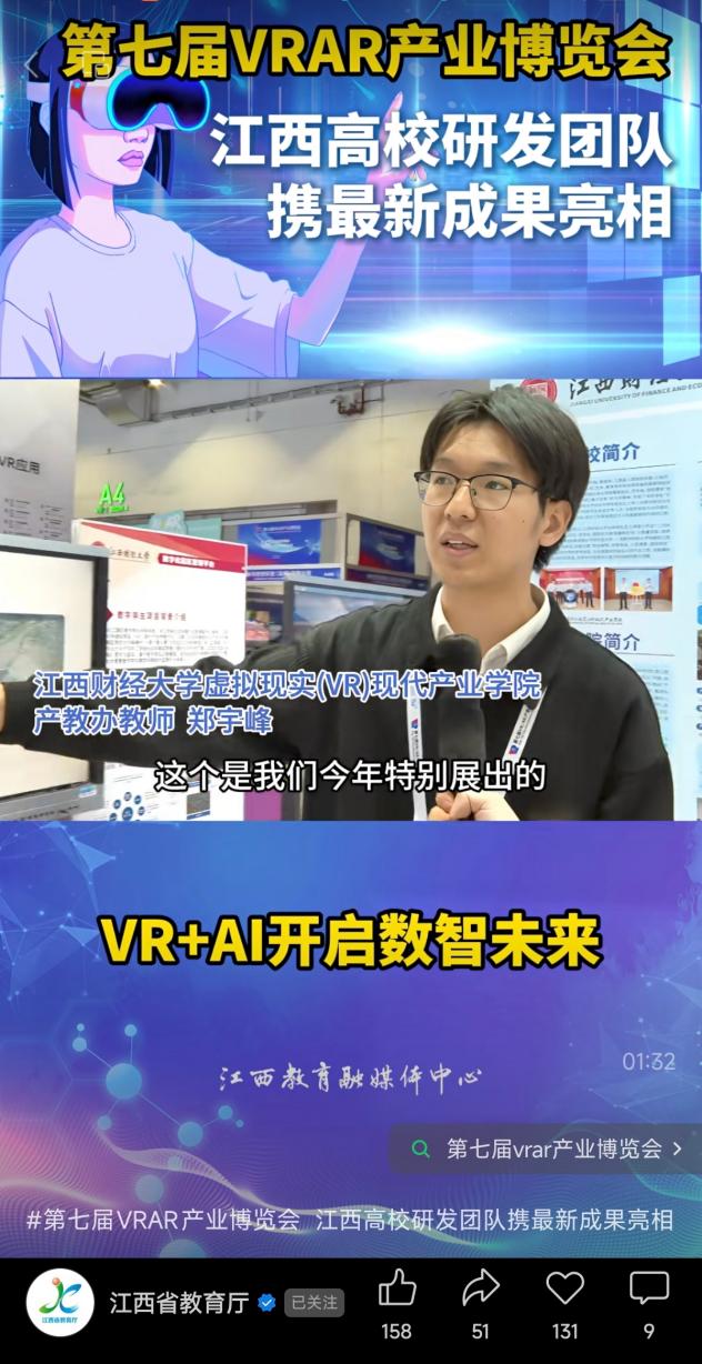 近日,中央电视台一套《晚间新闻》栏目、江西省教育厅官方视频号关注我校在第七届VR/AR产业博览会上在协同育人与前沿科研等方面的丰硕成果展示。