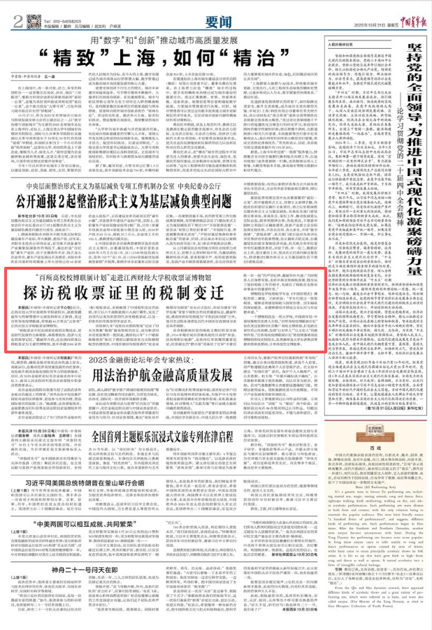 近日,《中国青年报》02版以“‘百所高校校博联展计划’走进江西财经大学税收票证博物馆——探访税收票证里的税制变迁”为题,报道我校以国内首座税收票证博物馆的文博资源,通过打造贴近青年的云思政课,充分发挥“以史育人”“以文化人”的教育作用。