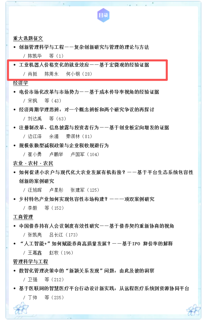 近日,由肖挺教授作为第一作者、陈周永(通讯作者,肖挺教授指导的博士研究生)与何小钢教授合作完成的论文《工业机器人价格变化的就业效应——基于宏微观的经验证据》,在《管理世界》2025年第11期正式发表。