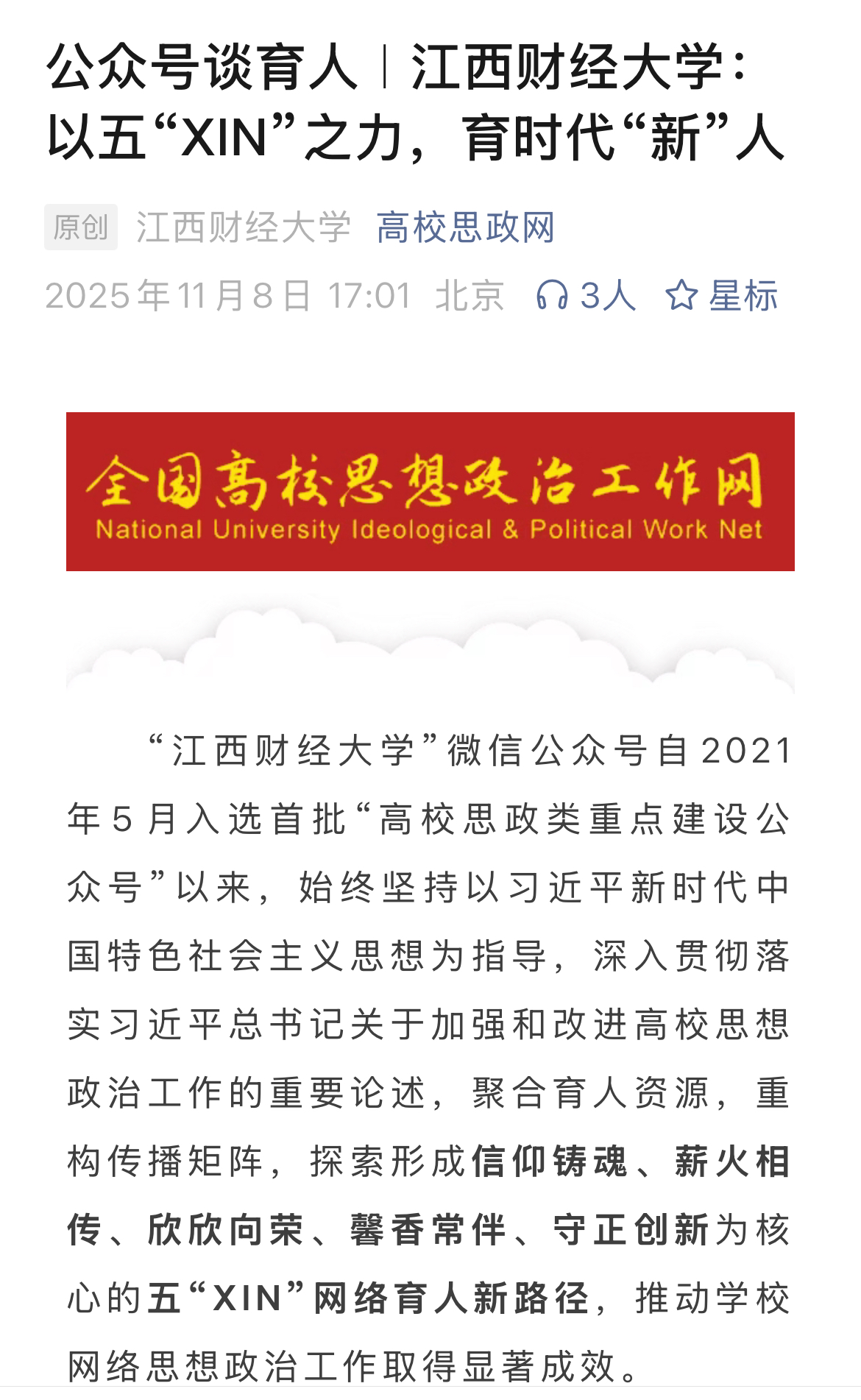 11月8日,全国高校思想政治工作网公众号以《江西财经大学:以五“XIN”之力,育时代“新”人》为题,在“公众号谈育人”专栏报道学校官方微信公众号育人成效。