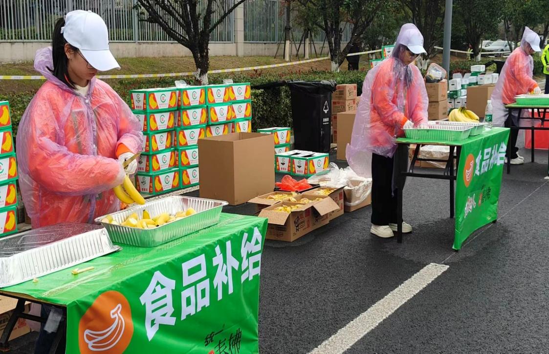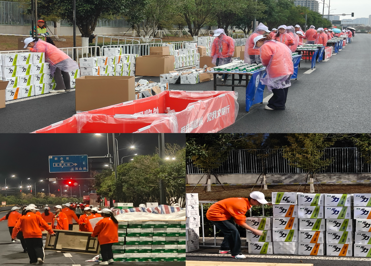 赛事进行期间,秋雨不期而至。志愿者们迅速穿戴雨衣后仍坚守岗位,通过高效沟通确保秩序维护与物资补给的顺畅运转。面对陆续经过的大批参赛者,各小组各司其职:饮水组及时递上清水并送上鼓励;食品组高效分发能量补给;浸水海绵组则贴心帮助选手缓解疲劳、保持清醒。他们秉持严谨的专业精神,践行“奉献、友爱、互助、进步”的志愿誓言,以一抹亮丽的“江财橙”,成为英雄城赛事中一道温暖而专业的风景。