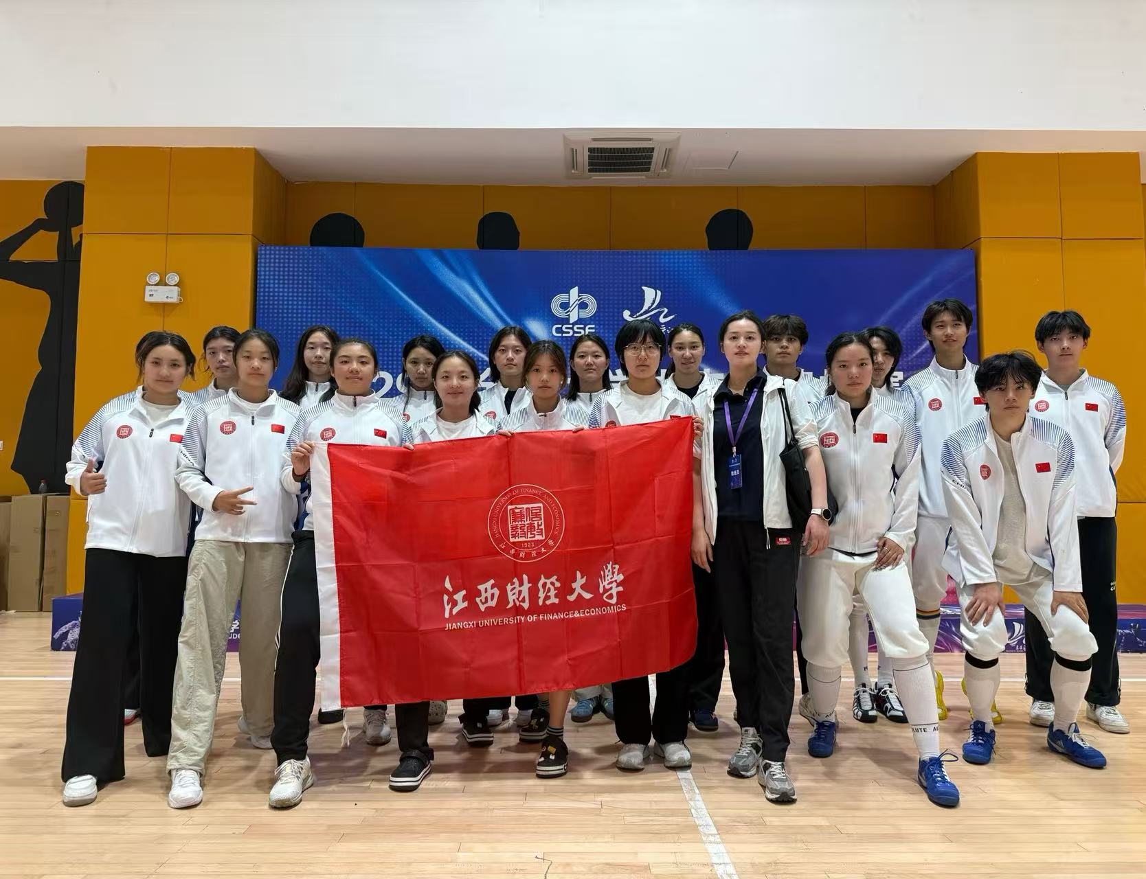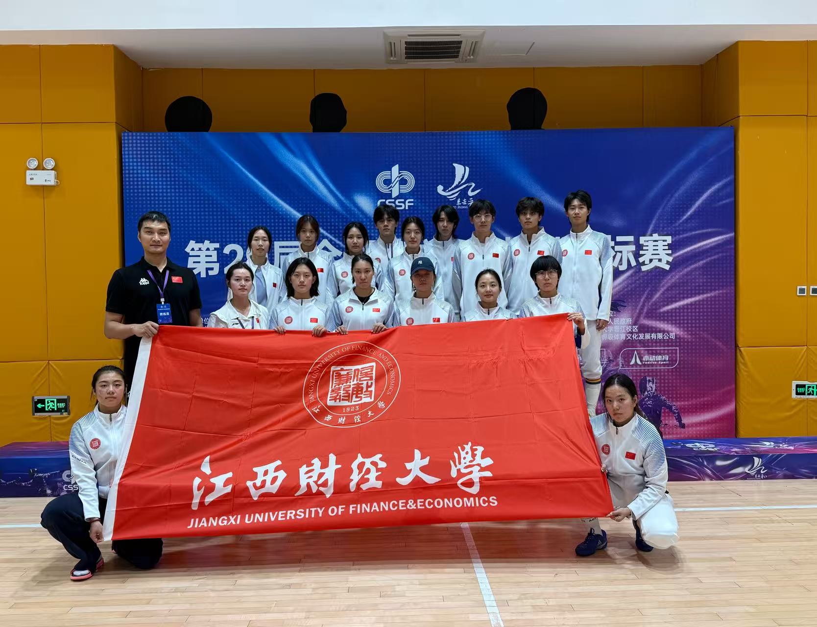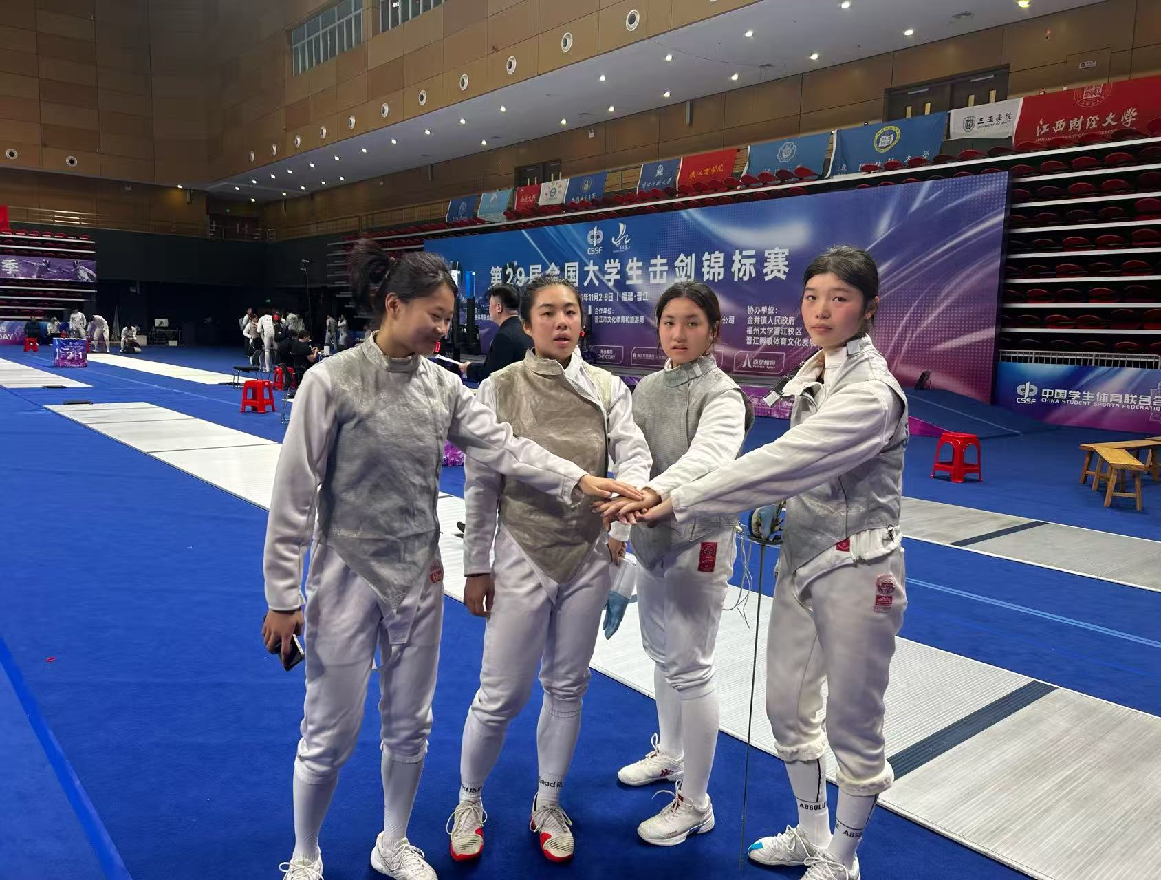 11月2日至4日,第29届全国大学生击剑锦标赛在福州大学晋江校区燃情开赛。这场集结全国105所高校顶尖剑客的巅峰对决中,江西财经大学击剑队19名学子在领队徐旭川及教练吴超群、石高峰的带领下,亮剑出鞘、奋勇争先,历经三天激烈角逐,斩获女子重剑团体第四名、女子佩剑团体第五名、男子佩剑团体第五名、女子花剑团体第六名的亮眼战绩,在全国舞台上尽显江财学子的昂扬风采与竞技实力。