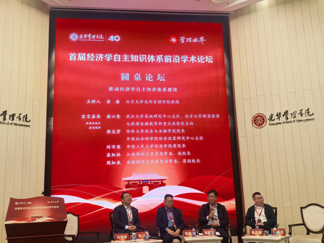 本次论坛由经济学自主知识体系学术共同体为发起单位,北京大学光华管理学院主办,管理世界杂志社提供学术支持,论坛设置主论坛、圆桌论坛及院长圆桌论坛三大环节。北京大学党委副书记姜国华、管理世界杂志社社长梁仰椿出席并致辞,中国人民大学原校长刘伟、辽宁大学原党委常委、经济学院原党委书记林木西、北京大学光华管理学院院长刘俏三位知名学者作主旨报告。其中,圆桌论坛上,9位专家聚焦“推动经济学自主知识体系建设”进行发言,分别是武汉大学/北京大学龚六堂教授、华侨大学/中国社会科学院郭克莎教授、南开大学梁琪教授、中国人民大学刘守英教授、东北财经大学吕炜教授、南京大学沈坤荣教授、我校袁红林教授、安徽财经大学周加来教授。院长圆桌论坛环节,厦门大学、对外经济贸易大学、上海财经大学等20多所学院院长及学术带头人围绕经济学自主知识体系建设的核心议题展开深度研讨,为构建具有中国特色、中国风格、中国气派的经济学自主知识体系凝聚共识。