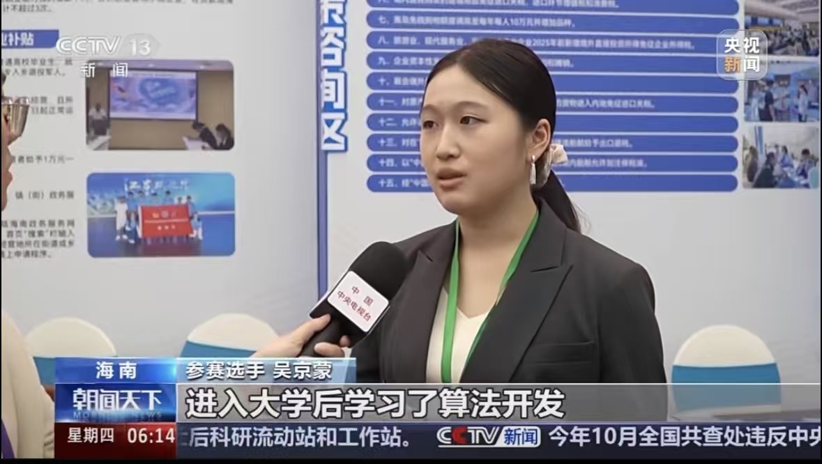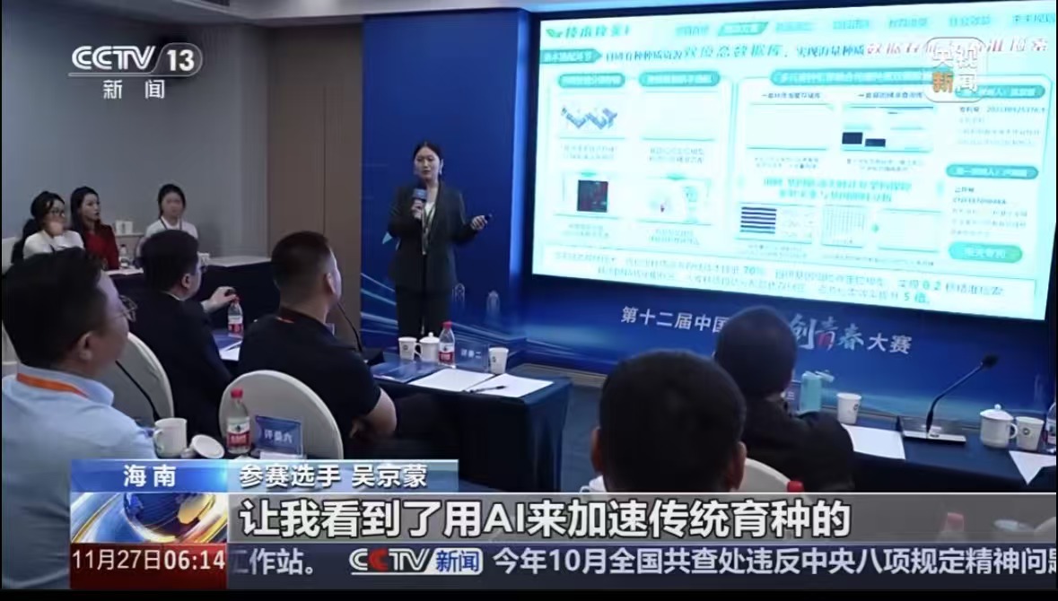 11月27日,央视新闻频道“朝闻天下”栏目报道了我校国际经济与政治学院本科生吴京蒙同学在第十二届“中国青年创青春大赛(数字经济专项)全国总决赛”中的出色表现。吴京蒙负责的“AI育种家——专注水稻育种数字经济化分析平台”项目在该比赛中,从九千六百多个参赛项目中脱颖而出,荣获全国铜奖,并受邀落地海南自由贸易港,实现从赛场到市场的关键跨越,引起CCTV、中国青年报等多家主流媒体采访报道。