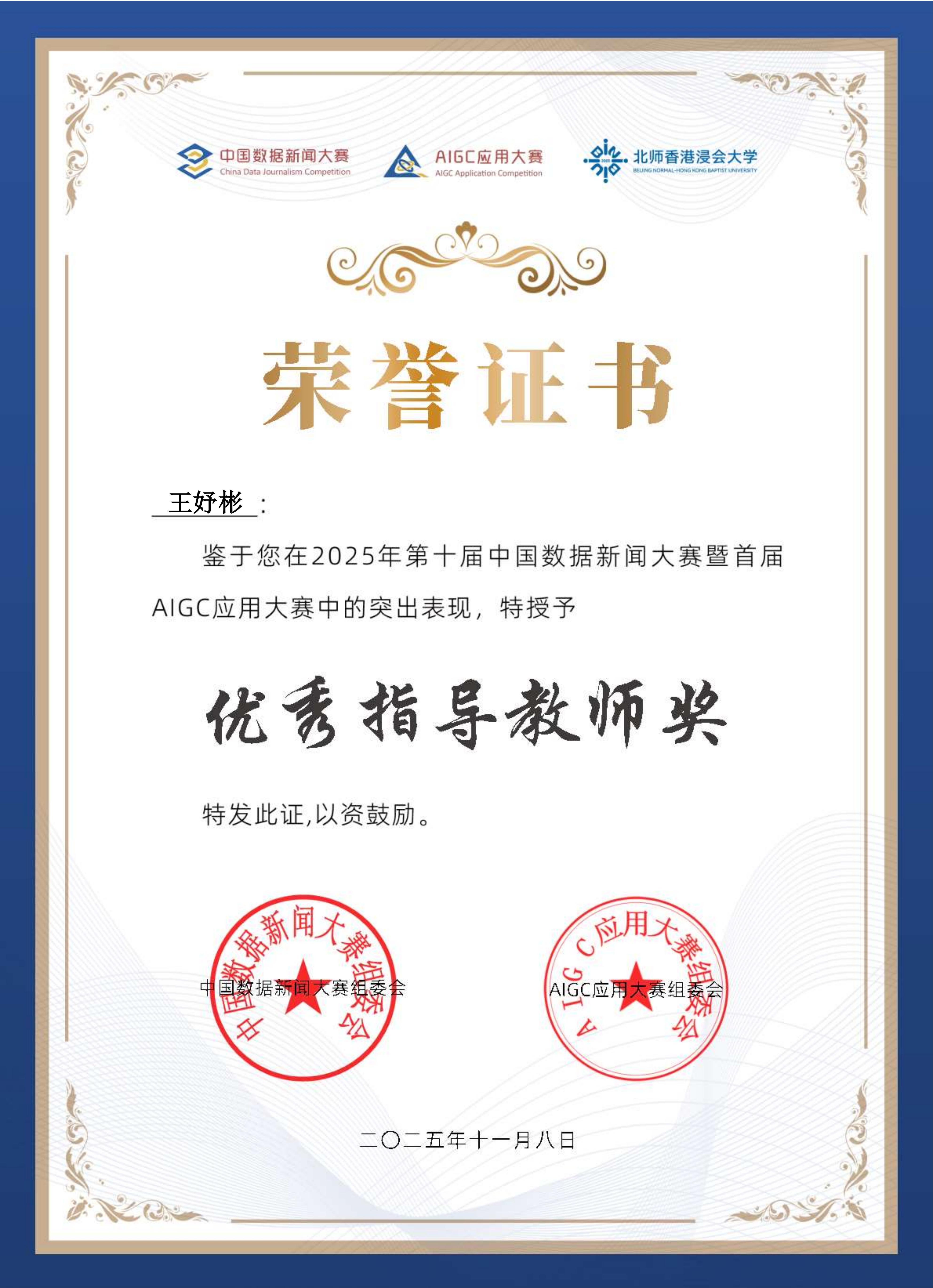 在英执教期间,王妤彬始终保持着新闻学者的本色。“我很珍惜这样的海外工作经历,也时常以做深度田野调查的方式来观察、反思自己正在从事的国际中文教育事业”,王老师如是说。深夜的英国恰好是中国的白天,她常常跨时区与国内团队讨论课题,指导学生参赛。2024年她获得第七届全国大学生网络编辑创新大赛优秀指导老师奖、2025年中国数据新闻大赛优秀指导教师奖,这些荣誉都是她辛勤付出的见证。
