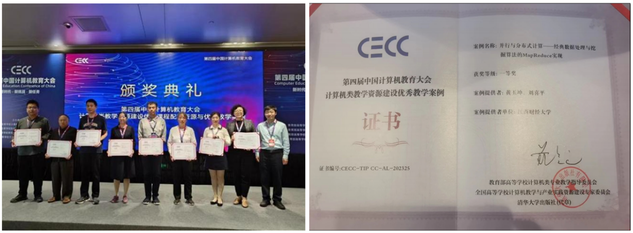 面对《并行与分布式计算》中“理论抽象、难以落地”的困境,黄老师以“经典算法+真实企业场景”破题。她将Map Reduce编程模型与Page Rank、K-Means等算法结合,带领学生完成从算法复现到系统部署的全流程项目。她与刘喜平教授共同开发的教学案例,荣获第四届中国计算机教育大会(CECC)优秀教学案例一等奖。