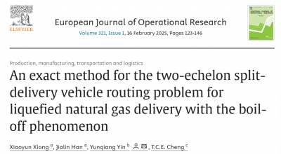 由信息管理与数学学院教师熊小云博士作为第一作者、韩加林教授作为第二作者及电子科技大学殷允强教授、香港理工大学T.C.ECheng教授四位学者合作完成的论文“An exact method for the two-echelon split-delivery vehicle routing problem for liquefied natural gas delivery with the boil-offphenomenon”于2025年2月在国际A类期刊European Journal of OperationalResearch正式发表。
