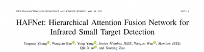 成果一:分层注意力融合机制。2025年发表于《IEEE Transactions on Geoscience and RemoteSensing》的研究论文《HAFNet: Hierarchical Attention Fusion Network for Infrared Small TargetDetection》提出了一种分层注意力融合网络,针对传统U-Net在复杂背景下的小目标检测不足进行改进。HAFNet在保留U-Net高效结构的基础上,引入双分支语义感知模块,通过标准卷积与空洞卷积的双通路交互增强上下文建模。网络同时设计分层特征融合编码器与解码器,以分层注意力引导和跳跃连接注入机制实现多尺度特征高效融合。实验结果显示,HAFNet在NUAA-SIRST、IRSTD-1K、NUDT-SIRST三个数据集上均取得领先性能,在精度、鲁棒性和泛化能力上全面优于现有方法,为复杂场景下的红外小目标检测提供了有效方案。
