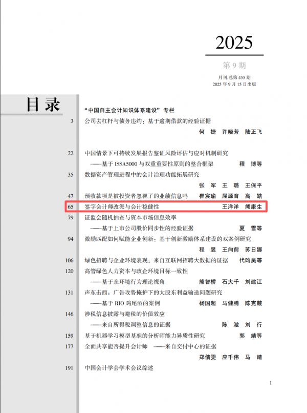 近日,会计学院王洋洋副教授与硕士研究生熊康生的研究成果《签字会计师改派与会计稳健性》在权威A期刊《会计研究》2025年第9期正式发表。