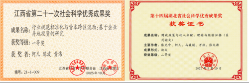 除上述学术成果外,何凡副教授团队的相关研究还荣获江西省第二十一次社会科学优秀成果奖一等奖、湖北省第十四届社会科学优秀成果奖二等奖等多项省部级奖励。