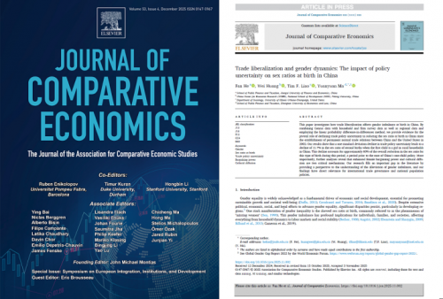 成果三:贸易政策对性别平等的影响。在线发表于JournalofComparativeEconomics期刊的论文《Trade liberalization and gender dynamics: The impact of policy uncertainty on sex ratios atbirthinChina》考察了贸易自由化对出生人口性别比的影响。主要研究结果显示:在农村家庭中,若首胎为女孩,贸易政策不确定性下降一个标准差将导致二胎出生性别比下降11.7%,这一影响约占同期该类出生性别比整体降幅的60%。女性议价能力的提升与性别平等观念的文化传播是重要的作用路径。研究凸显了经济政策在推动社会发展中的积极作用,从机会公平视角为改善社会平等提供了新的思路。