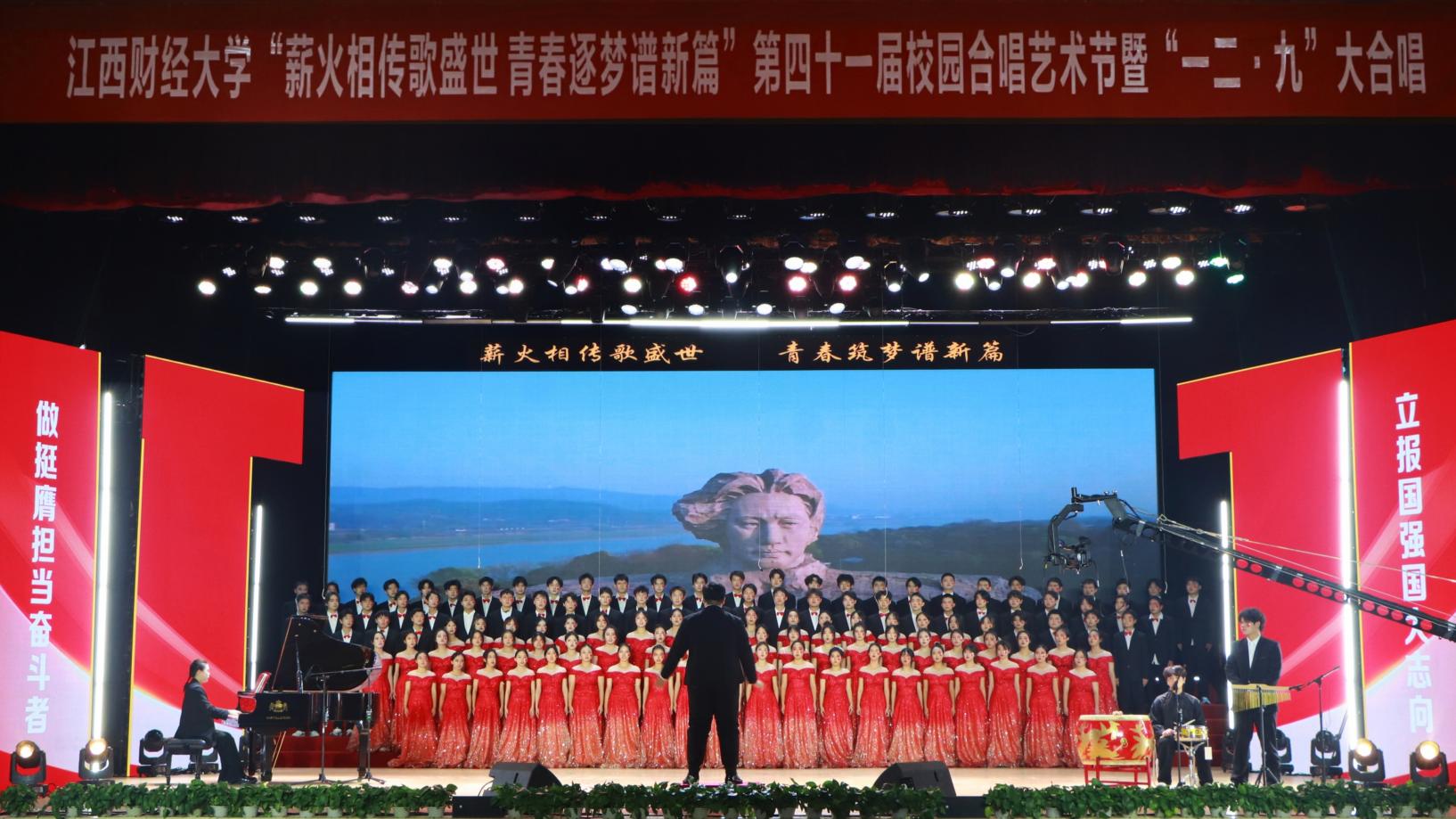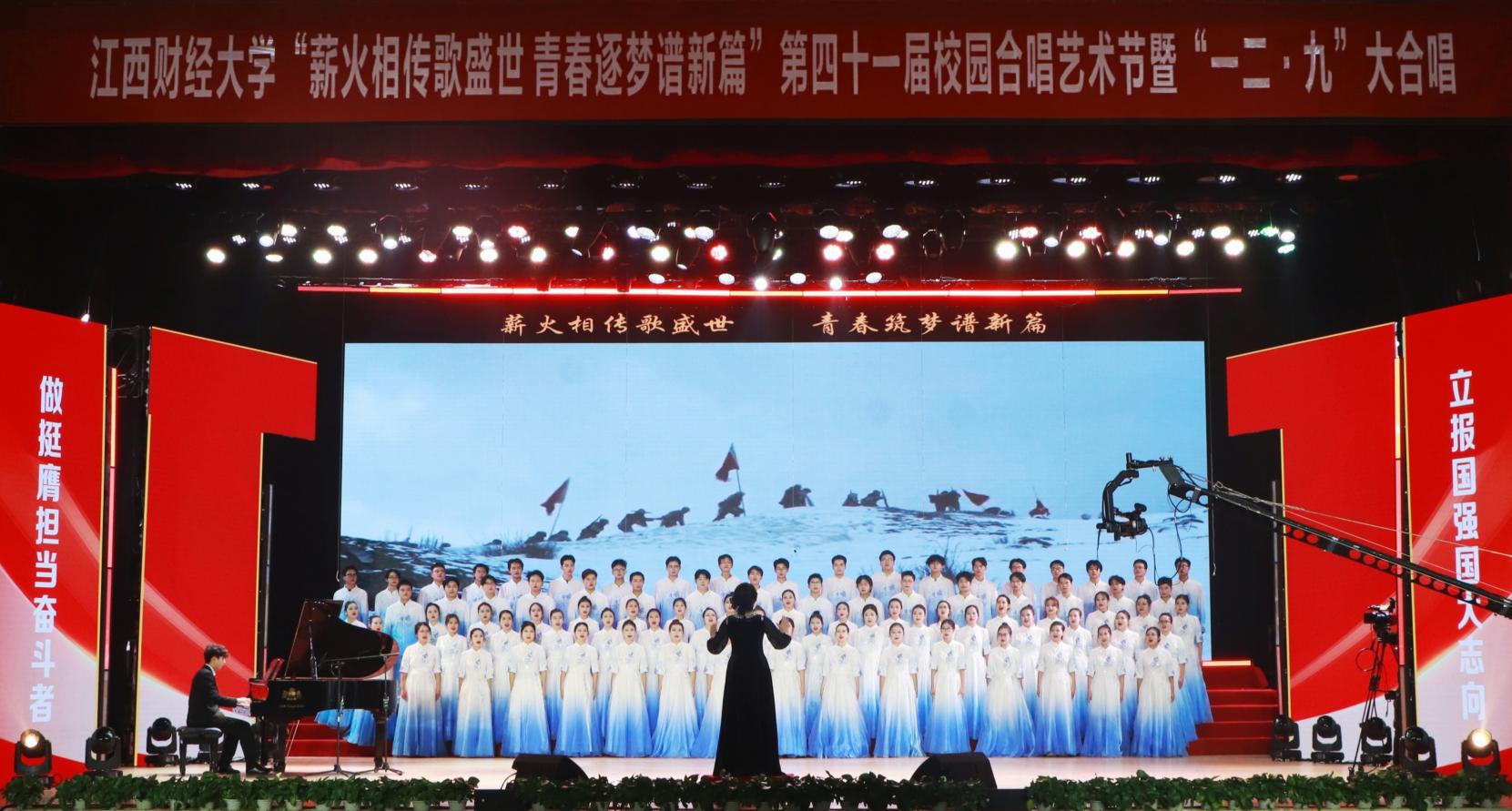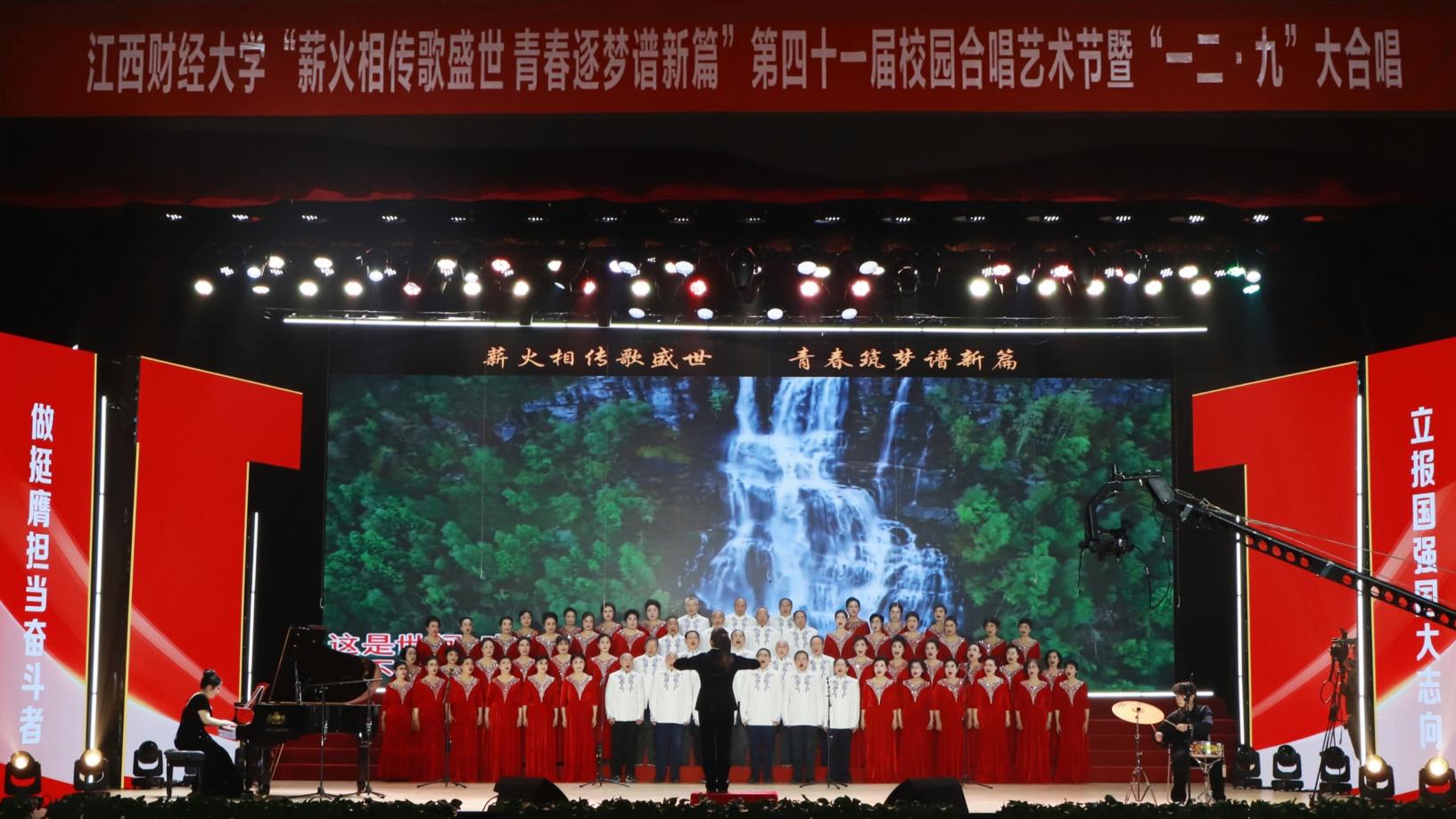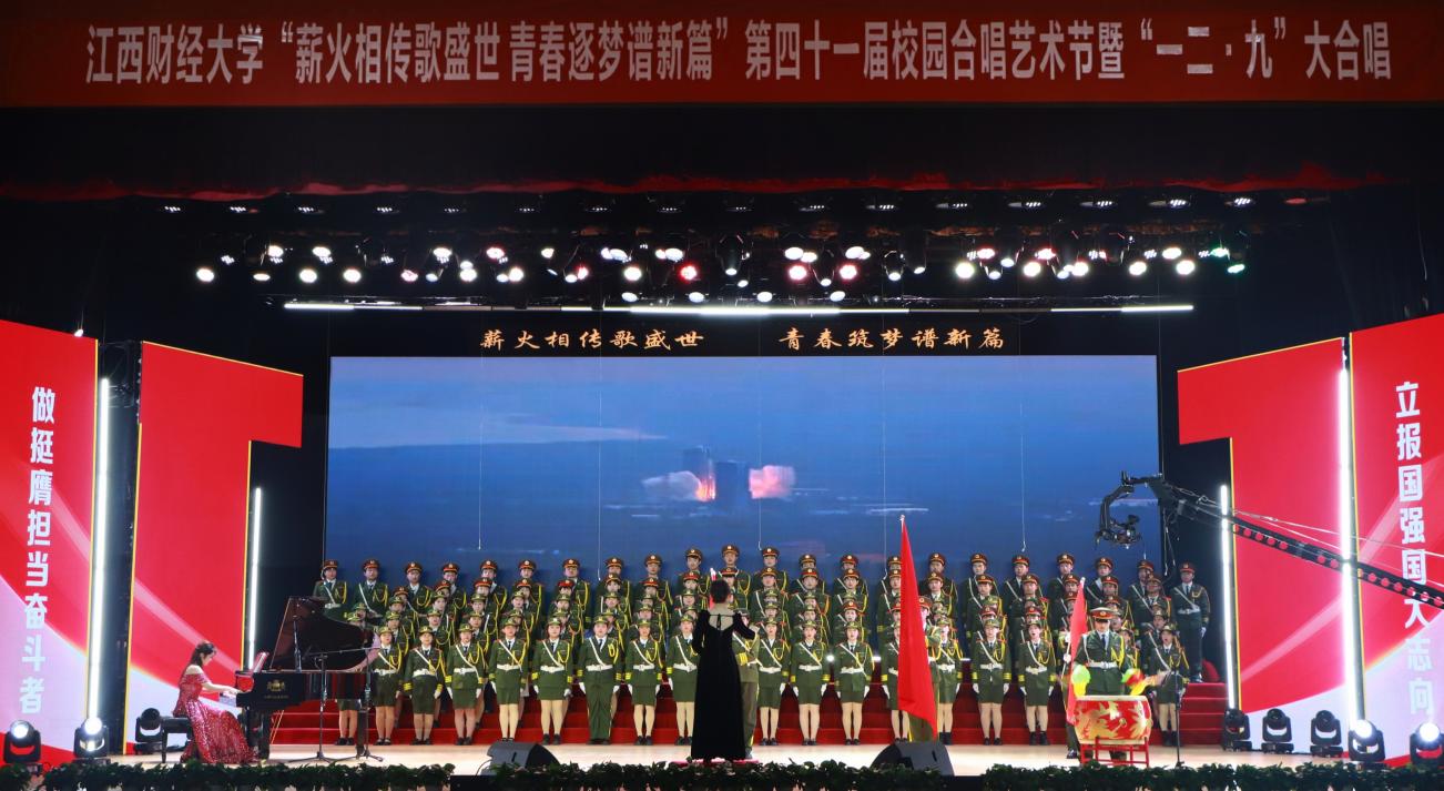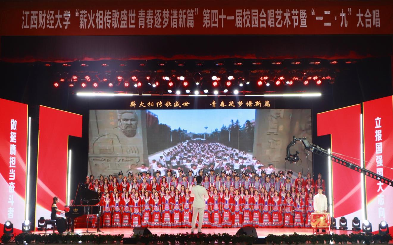 12月14日,“薪火相传歌盛世 青春逐梦谱新篇”——第四十一届校园合唱艺术节暨一二·九大合唱活动在我校蛟桥园校区大礼堂举行。副校长李春根、贺丹君,江西省纪委省监委驻江西财经大学纪检监察组组长、党委常委、校纪委书记黄海军,副校长谢花林,各单位党政负责人,教职工,离退休老同志和我校千余名师生代表现场欣赏演出。