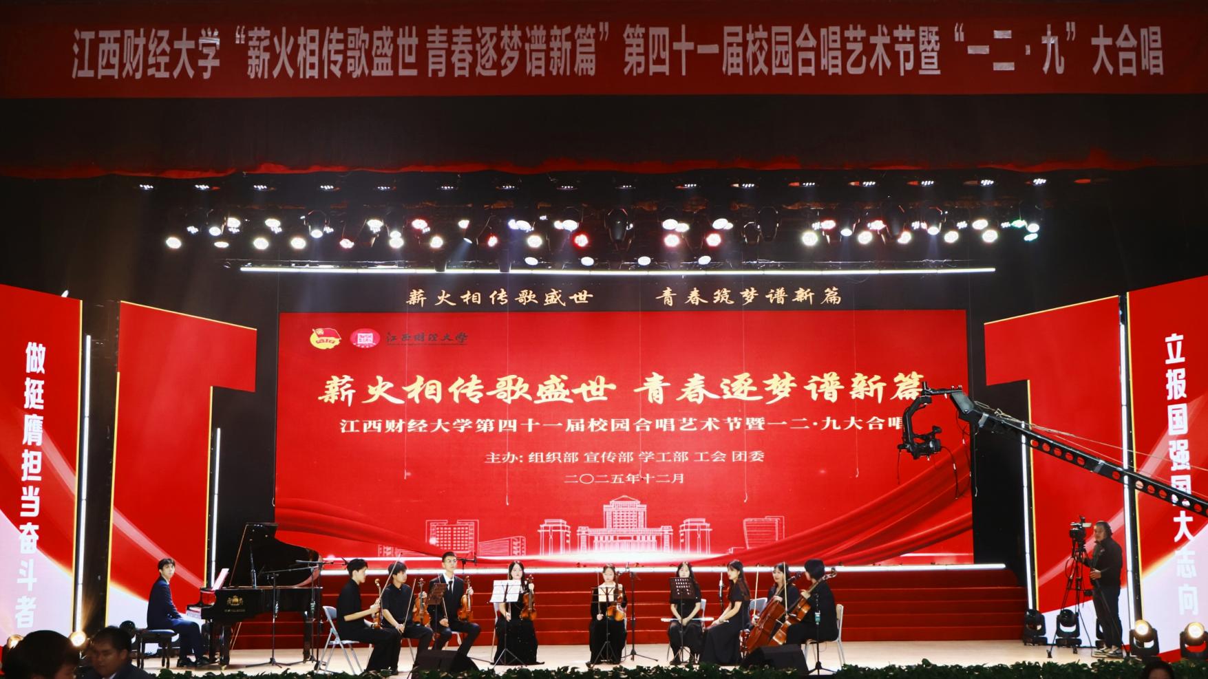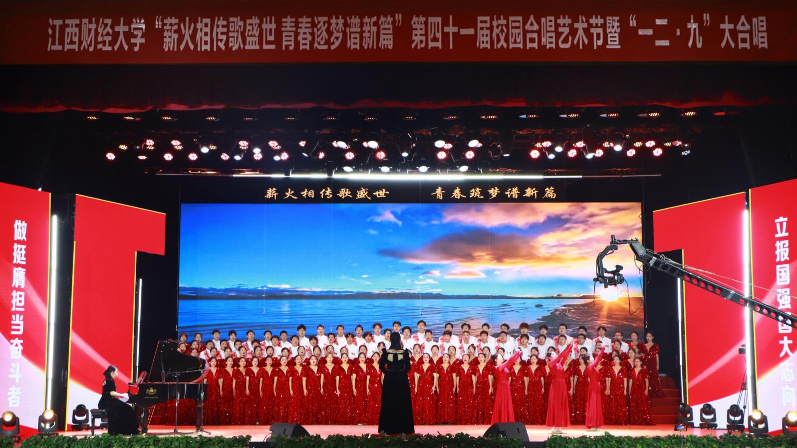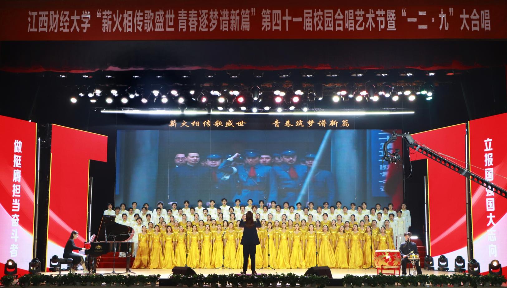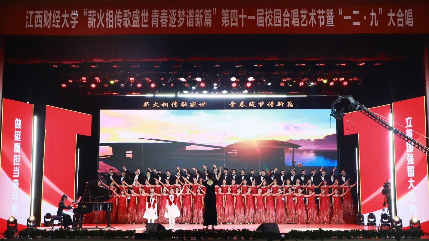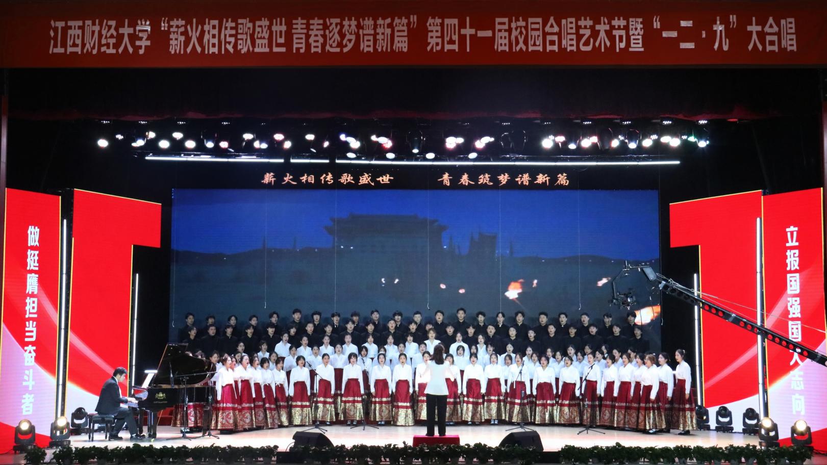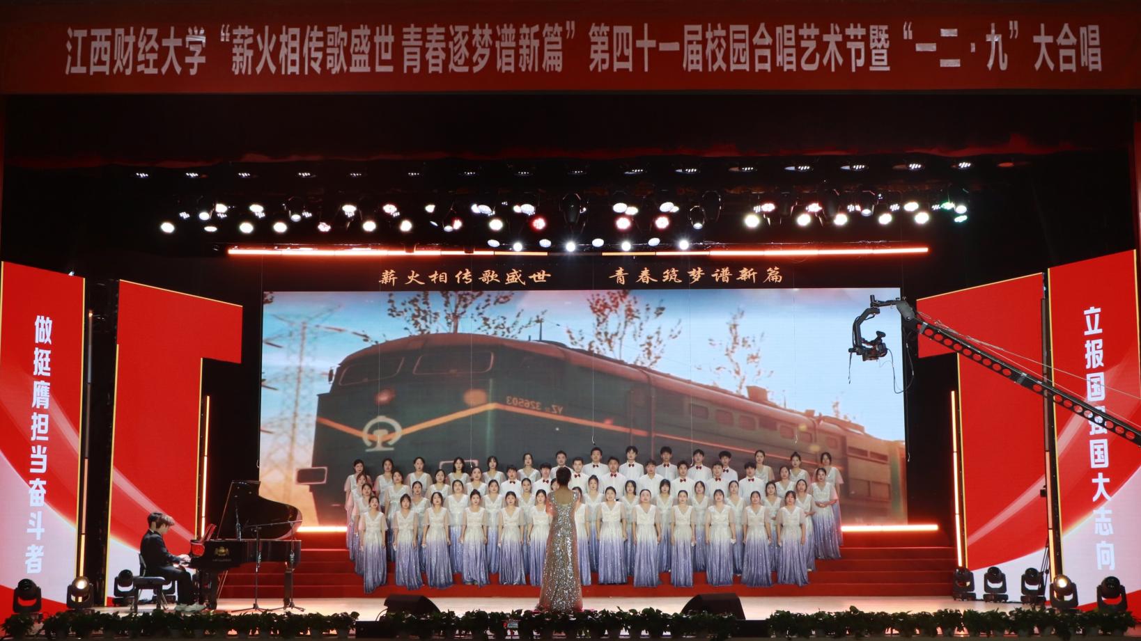 12月14日,“薪火相传歌盛世 青春逐梦谱新篇”——第四十一届校园合唱艺术节暨一二·九大合唱活动在我校蛟桥园校区大礼堂举行。副校长李春根、贺丹君,江西省纪委省监委驻江西财经大学纪检监察组组长、党委常委、校纪委书记黄海军,副校长谢花林,各单位党政负责人,教职工,离退休老同志和我校千余名师生代表现场欣赏演出。