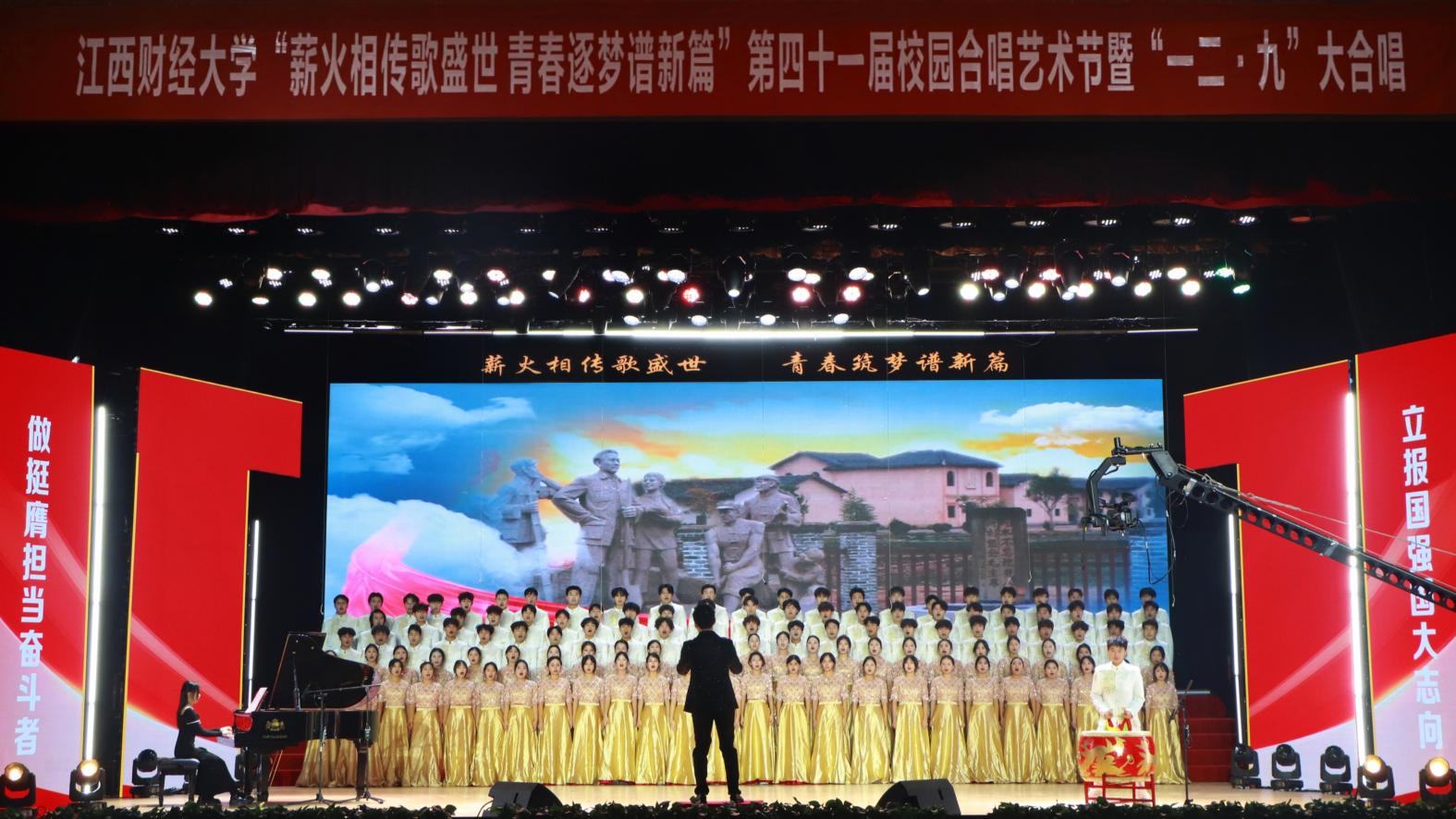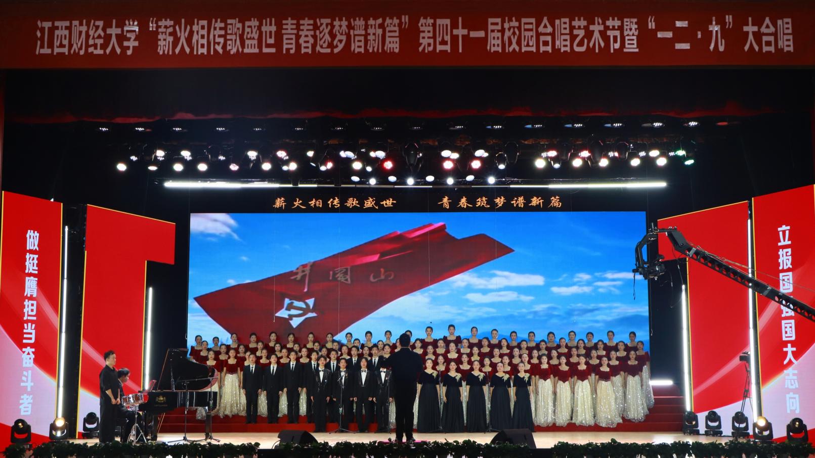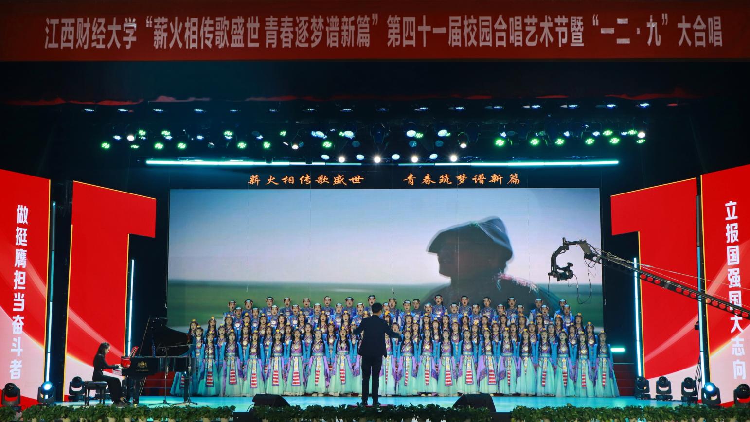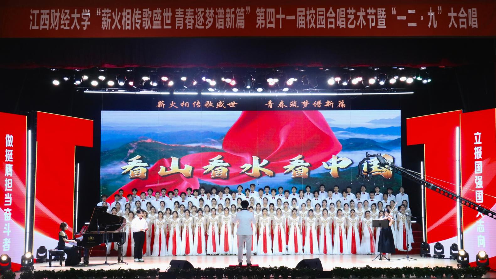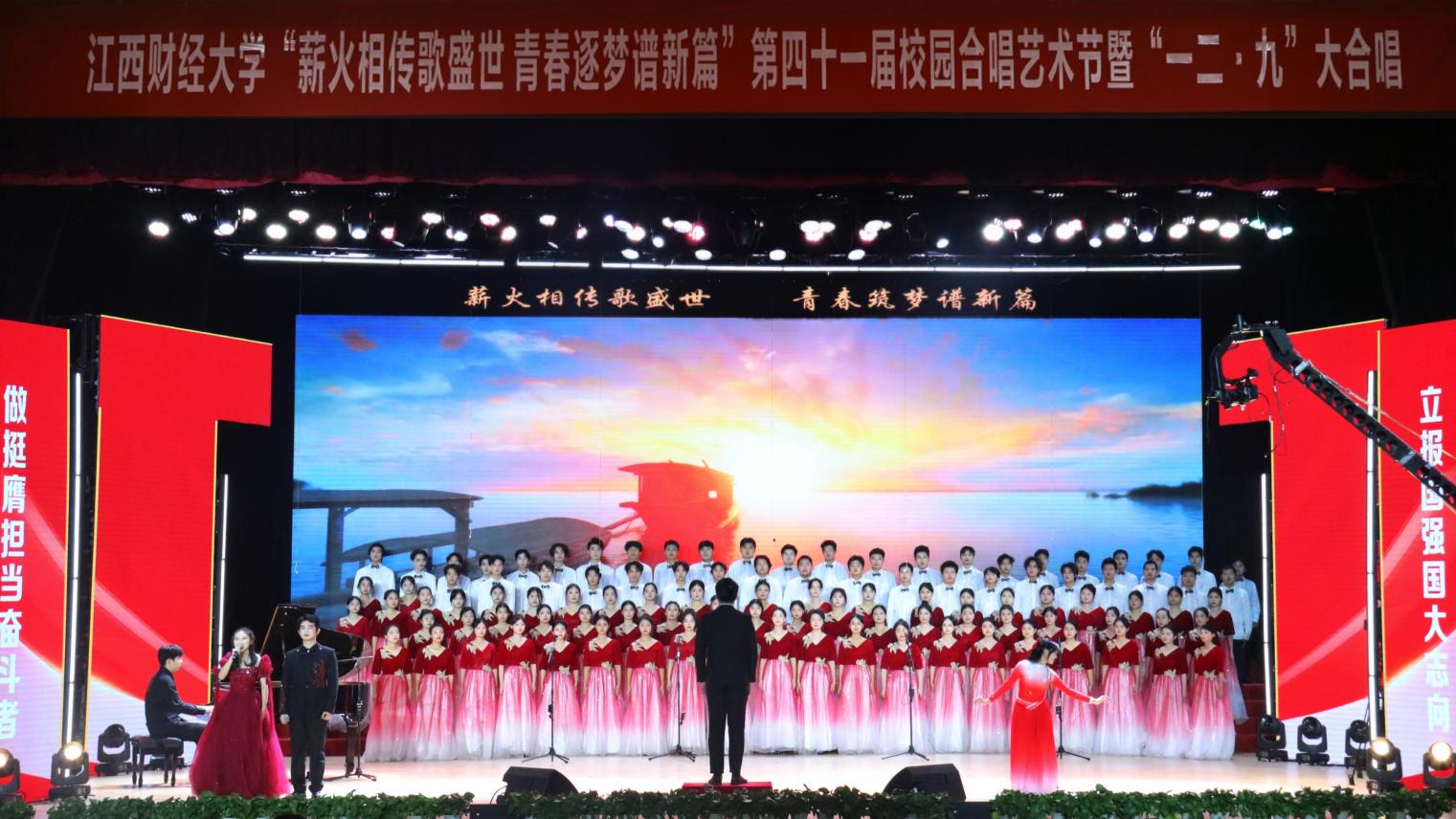 12月14日,“薪火相传歌盛世 青春逐梦谱新篇”——第四十一届校园合唱艺术节暨一二·九大合唱活动在我校蛟桥园校区大礼堂举行。副校长李春根、贺丹君,江西省纪委省监委驻江西财经大学纪检监察组组长、党委常委、校纪委书记黄海军,副校长谢花林,各单位党政负责人,教职工,离退休老同志和我校千余名师生代表现场欣赏演出。