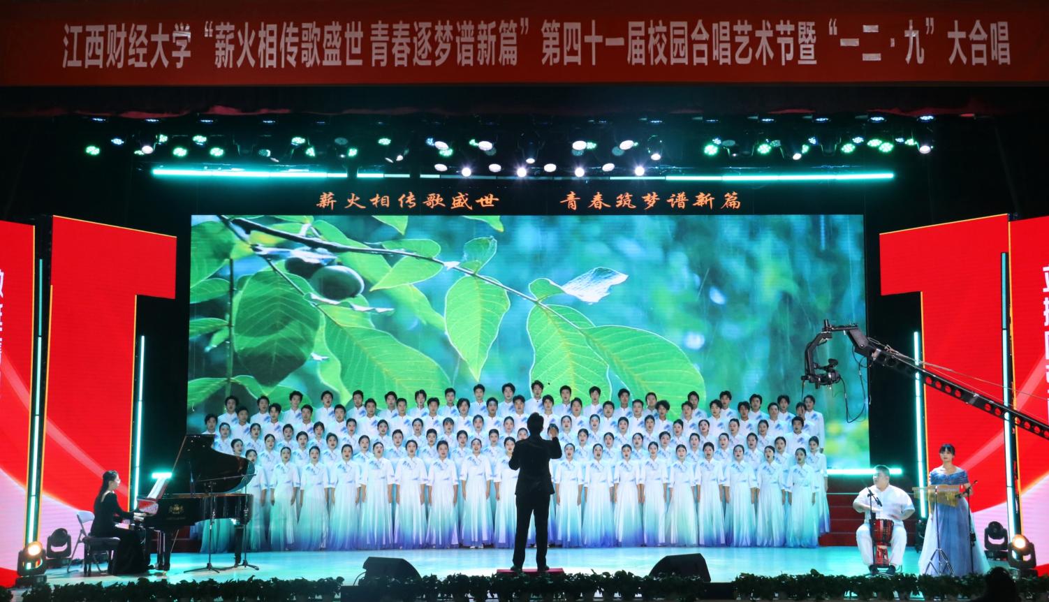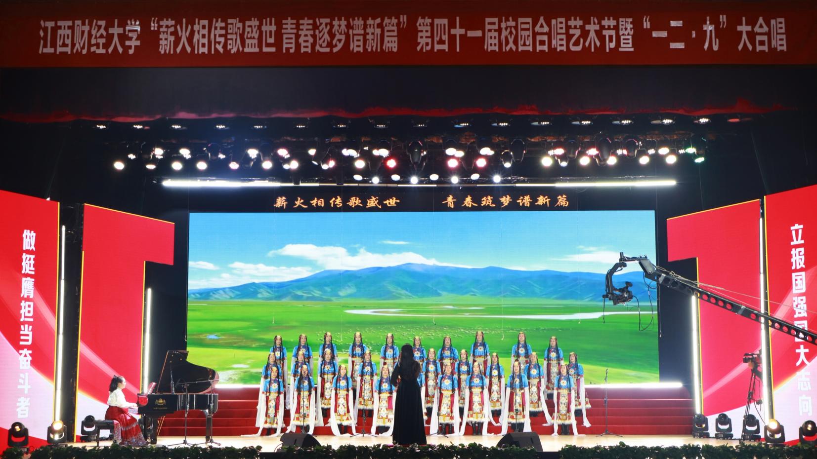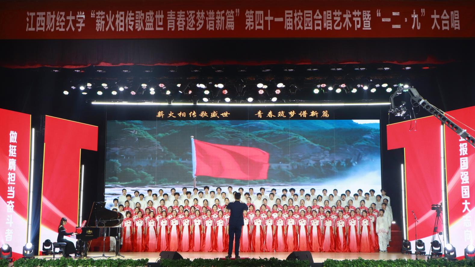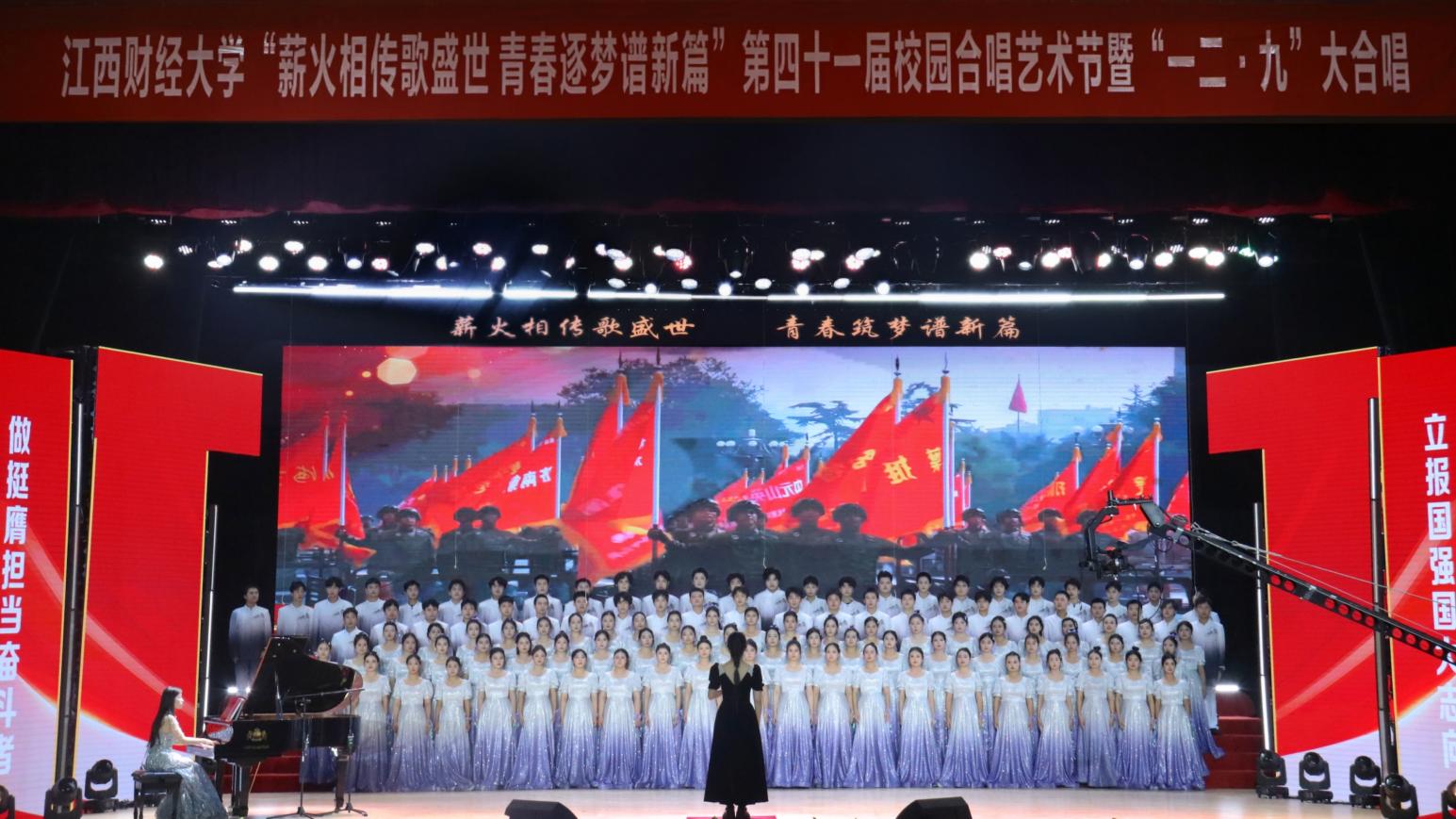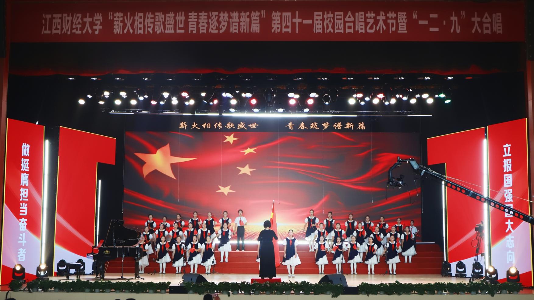 12月14日,“薪火相传歌盛世 青春逐梦谱新篇”——第四十一届校园合唱艺术节暨一二·九大合唱活动在我校蛟桥园校区大礼堂举行。副校长李春根、贺丹君,江西省纪委省监委驻江西财经大学纪检监察组组长、党委常委、校纪委书记黄海军,副校长谢花林,各单位党政负责人,教职工,离退休老同志和我校千余名师生代表现场欣赏演出。