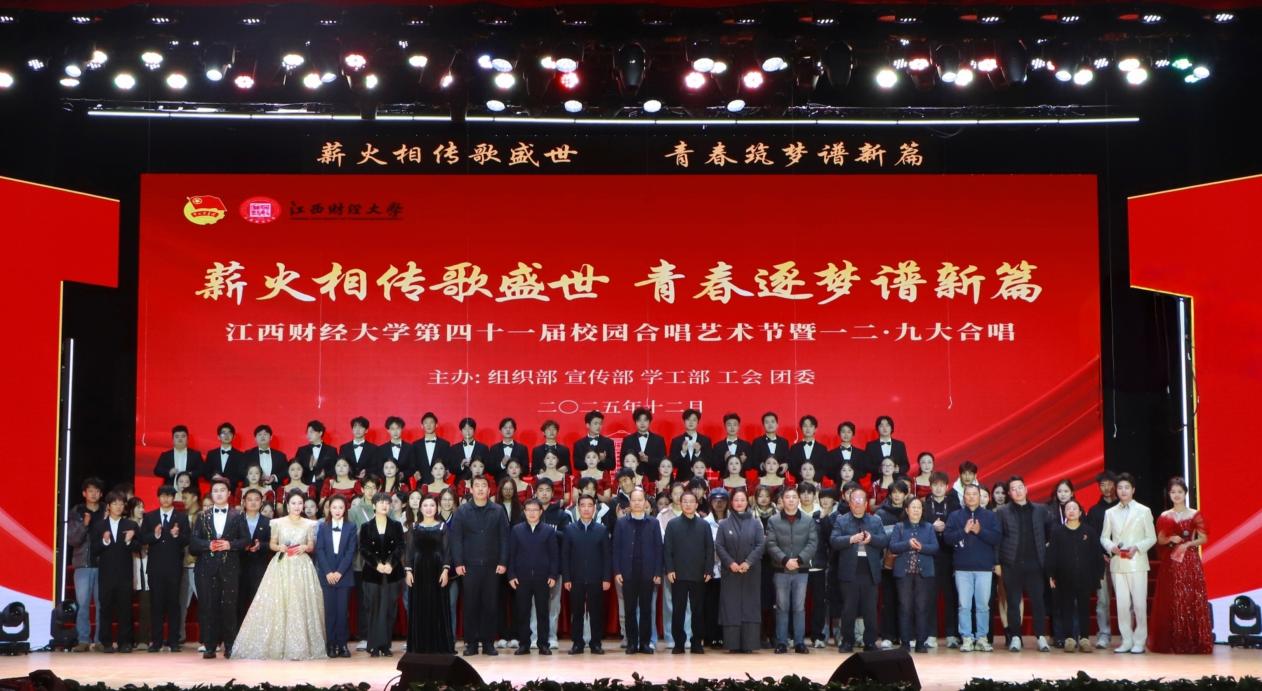 师生们以歌为媒,以乐为舟,在动人的旋律中回溯历史征程,礼赞时代新篇,共谱时代华章。本次合唱比赛在大学生艺术团带来的《器乐演奏》中拉开帷幕,江西财经大学附属中学合唱团演唱的《红领巾爱祖国》,童声清澈动人,歌声中洋溢着对祖国的真挚热爱,展现了新时代青少年昂扬向上的精神风貌;夕阳红合唱团演唱的《爱永在》,则以其历经岁月沉淀的深情,诠释了信仰的永恒与真情的力量;大学生艺术团演唱的《玉门关》,则用合唱之声重构千年边塞的诗意与苍茫,旋律跌宕间尽显文化传承的青春力量。信息管理与数学学院演绎的《四渡赤水出奇兵》,生动再现了红军将士的英勇无畏和铁血丹心;金融学院的《十送红军》以深情旋律,再现了军民之间的鱼水情深;社会与人文学院的《红船向未来》则溯源于党的诞生,颂扬开天辟地、敢为人先的初心伟力;公共管理学院的《阿佤人民唱新歌》充满民族风情,跃动着新时代的欢欣;教工美之声合唱团的《卓玛》悠扬婉转,唱出对圣洁美好的深情礼赞;软件与物联网工程学院的《保卫黄河》以排山倒海之势,唱出了中华民族不屈的怒吼与保卫家园的坚定决心;虚拟现实(VR)现代产业学院的《我的祖国》、经济学院的《看山看水看中国》与数字经济学院的《大中国》先后唱响,三首作品或深情礼赞壮丽山河,或豪迈歌颂辽阔华夏大地,共同抒发了学子对祖国深沉而炽热的情感;工商管理学院的《祖国不会忘记》与研究生合唱团的《人世间》,则从不同角度致敬默默奉献的英雄,守望平凡的烟火,唱响了个人命运与家国安宁紧密相连的深沉共鸣;会计学院的《世纪春雨》寓意盎然生机润泽华夏;统计学院的《新的天地》与计算机学院的《向往》表达了砥砺初心、逐梦复兴的炽热追求;财政税务学院的《乘风破浪再出发》与法学院的《再一次出发》,则以铿锵誓言展现了不畏艰险、向梦而行的坚定姿态;国际经济与政治学院的《天路》歌颂了民族团结、共筑梦想的伟大成就;外国语学院与体育学院联袂演绎的《我们走在大路上》,步伐铿锵,展现出中国青年昂扬走在时代大道上的自信力量。设计与艺术学院联唱的《游击队歌》与《领航》,将历史精神与时代引领相结合,前者回望烽火岁月,后者高歌时代征程,传递出信仰的力量,为这场晚会完美收尾。