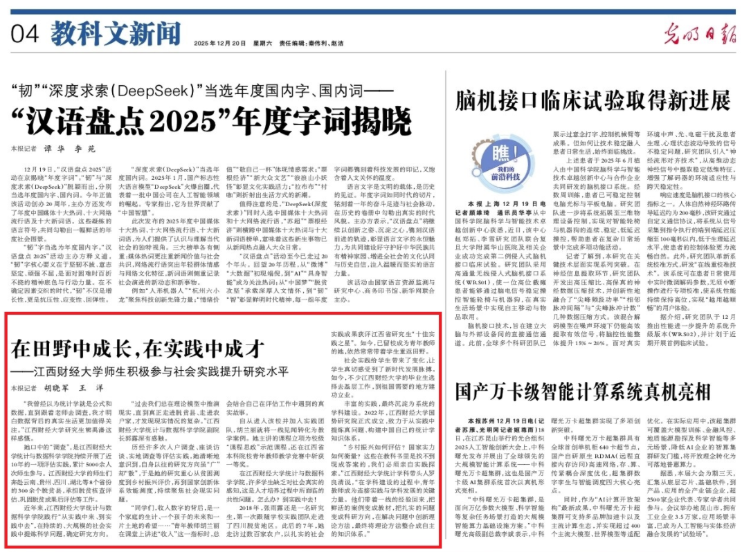 12月20日,《光明日报》教科文版报道了我校统计与数据科学学院师生积极投身社会实践,在实践锻炼中实现研究水平提升与个人成长的动人篇章。