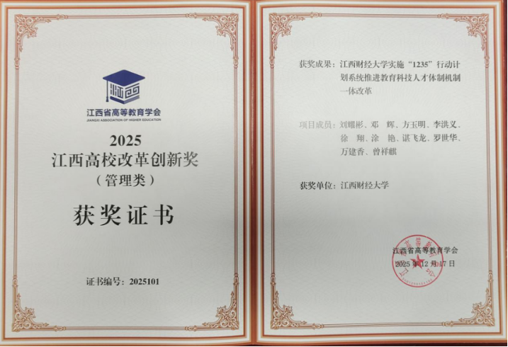 12月27日,2025年江西高校改革创新奖颁奖仪式在南昌举行。我校撰写的《江西财经大学实施“1235”行动计划推进教育科技人才体制机制一体改革》项目,从110多所高校中脱颖而出,荣获2025年江西高校改革创新奖(管理类)。副校长阙善栋代表学校领奖。