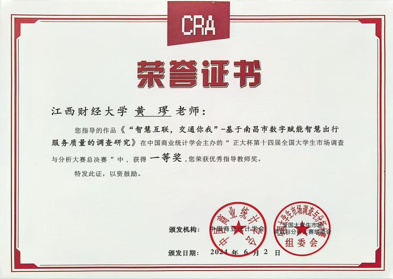 统计学作为一门兼具理论深度与实践价值的学科,既要求扎实的知识积淀,更强调创新思维的突破。这一点,在黄璆的教学实践中得到了生动诠释。她始终坚信,统计学教学的核心不仅在于知识的传授,更在于能力的培育 —— 既要点燃学生对新兴前沿领域的探索好奇心,也要锤炼他们将理论知识落地实践的应用能力,更要塑造他们把握时代热点与国家战略导向的敏锐度。在教学过程中,黄璆积极搭建 “学赛结合” 的桥梁,将课堂培育的核心能力转化为竞赛的内在动力,让每一份竞赛作品都兼具 “落地性”与“实用性”,真正实现以赛促学、以赛促练。