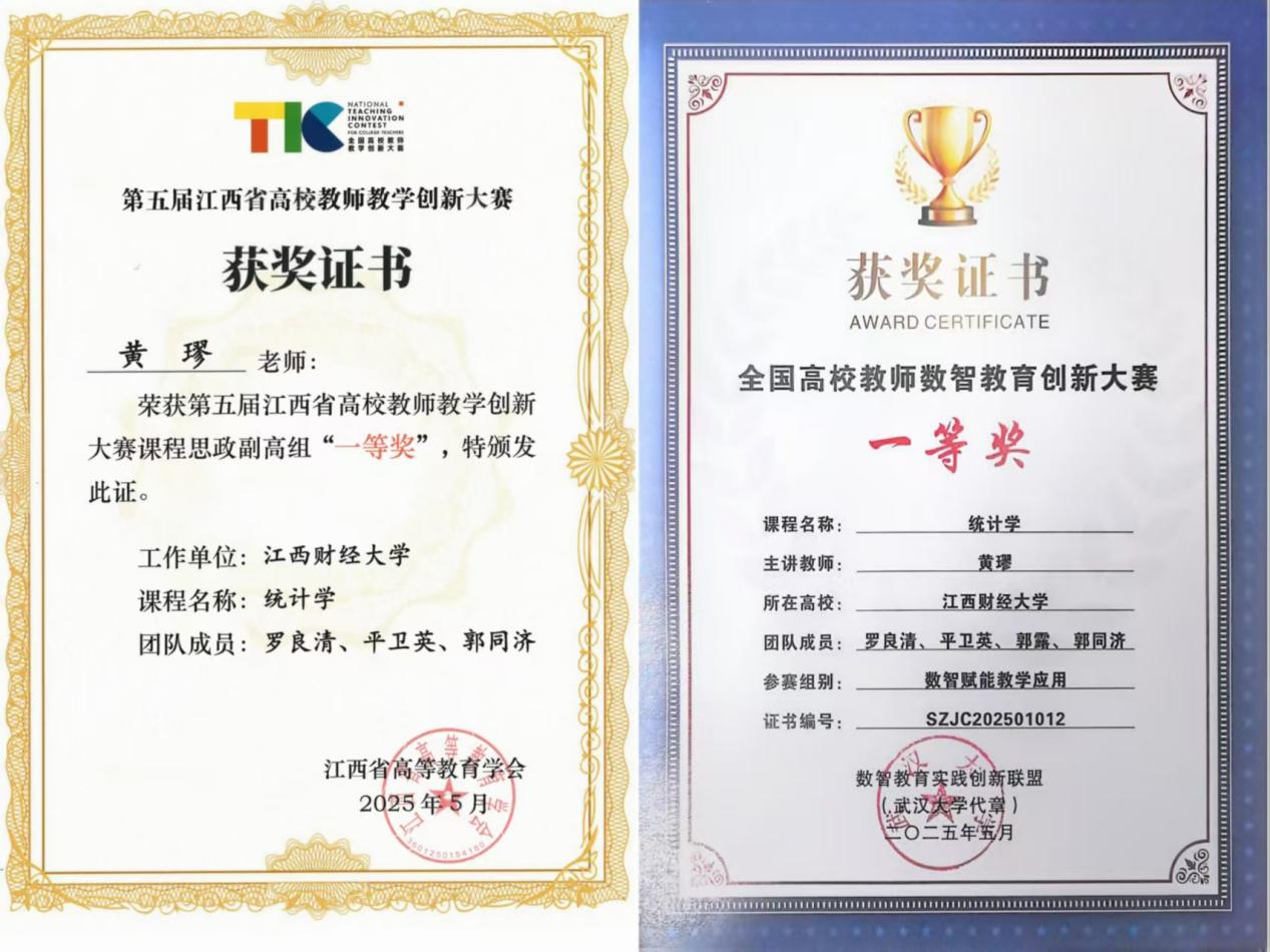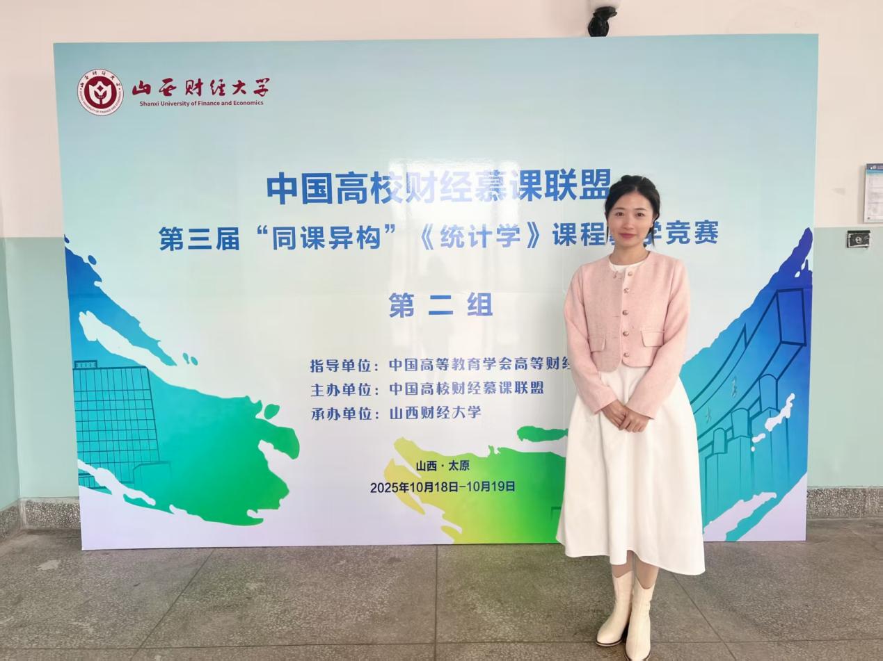 “三尺讲台勤耕耘,一片匠心竞芳华。”黄璆不仅在日常工作中以“润物细无声”的方式培育学生,在教学竞赛的舞台上更是绽放光彩。近期,她在中国高校财经慕课联盟第三届“同课异构”教学竞赛的《统计学》课程竞赛中斩获一等奖,这一成绩既是对她扎实教学功底的充分认可,更彰显了她灵活创新的课堂呈现智慧。